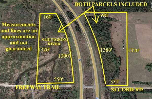 26 ACRES, TWO PARCELS TOTAL, ELECTRIC ON ONE, 900+ FEET ON THE STURGEON RIVER ON THE OTHER. This is truly a one of a kind parcel split by I-75 in Wolverine. Set up camp at the end of the road on one side off Secord Road where the electric is installed, then buzz around to get to the other one and have lunch on your very own chunk of the famous blue ribbon trout stream, The Sturgeon River. This will not last long.