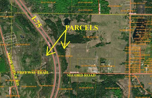 Take Secord Road to the end for the one parcel. For the other parcel take Molineux Rd south to Lance Lake Rd., make right and go to Trowbridge Rd., make right and go to Freeway Trail and take to the end. I-75 splits the parcel.