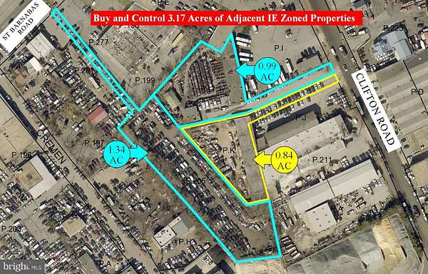 Here's a Big Opportunity to buy paved Industrially zoned property Inside the Beltway. 2 Contiguous properties to be sold together= 4743 Clifton Rd & 4630 St Barnabas Rd, Temple Hills, MD 20748. Tax Account #s 0493734 & 0649590 The property totals 2.33 acres of IE ZONED land, off of MD Route 414 St Barnabas Rd., inside the Beltway. There is a 6,720 SF Building on the Clifton Rd parcel, as well as a 1,074 SF auto workshop, and a 630 SF storage structure, totaling 8,424 SF. Both properties are currently being used to store cars. The Sellers will need some time to remove all vehicular inventory. Call us for details. This is a highly sought after zoning that permits MANY uses, which includes commercial vehicular sales, rentals, repairs and maintenance. Brand new 5-Ton HVAC System installed in 2025. ADDITIONALLY The adjacent property that shares the Clifton Rd driveway with this site is now available for sale at $2,000,000. It is 0.84 acres with a 2 story 13,000 SF building that has great potential for a personalized interior build-out. The total acreage of the 3 adjacent parcels is 3.17, with multiple buildings that add up to more than 21K SF- all IE (Industrial, Employment) zoned which is both rare and highly desired.