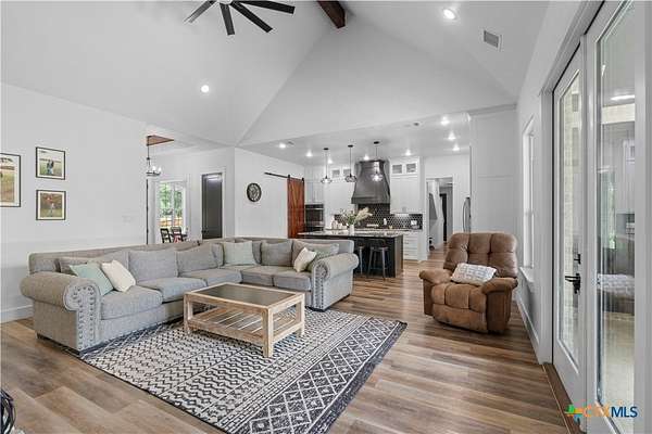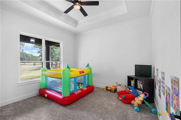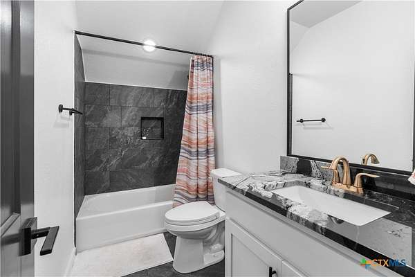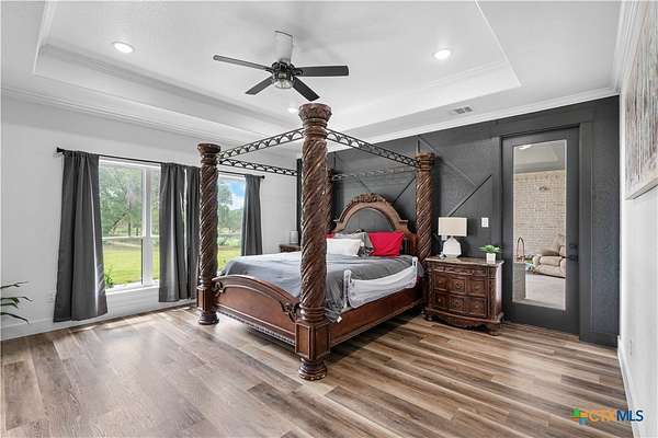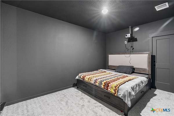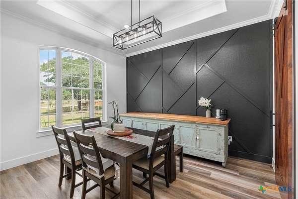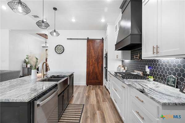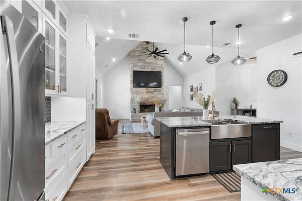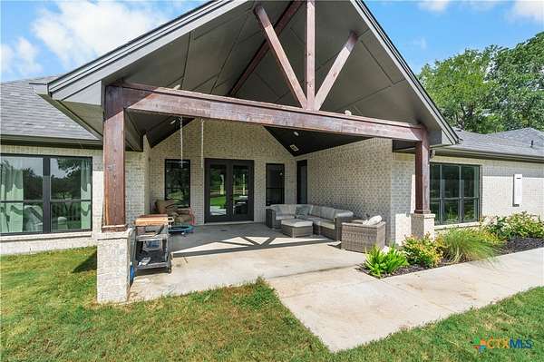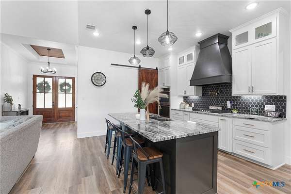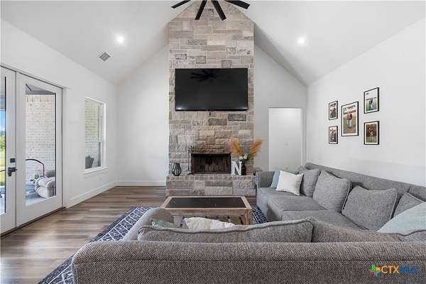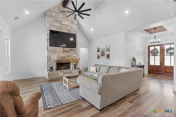 This gorgeous 4-bedroom, 3.5-bath custom home offers over 3,000 sq. ft. of beautifully designed living space with luxury finishes throughout. The open-concept floor plan features a spacious living room with vaulted ceilings and a striking rock fireplace, flowing seamlessly into the kitchen with custom cabinetry, granite countertops, and a gas cooktop. The dining room shines with a stylish accent wall, making it the perfect space for gatherings. The primary suite is a true retreat with a tray ceiling, spa-like bath featuring a freestanding tub, walk-in shower, and expansive master closet. A large safe room adds peace of mind, while an upstairs game room provides extra space for fun and relaxation. Step outside to enjoy a vaulted back porch overlooking mature shade trees, ideal for entertaining or simply unwinding. The property is complete with a fenced front entry, automatic gate, and beautiful landscaping that enhances its charm and privacy. This home perfectly blends elegance, comfort, and function-an absolute must-see!