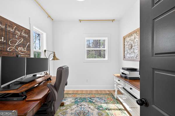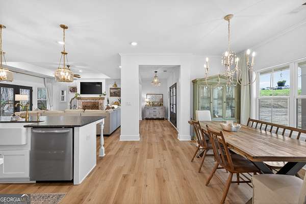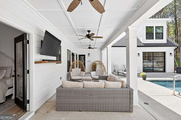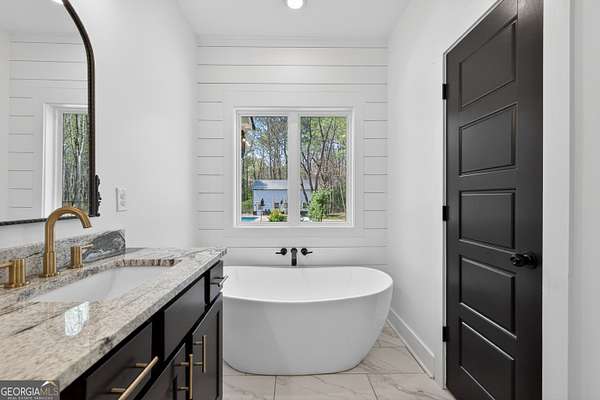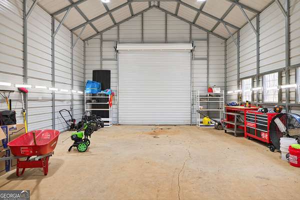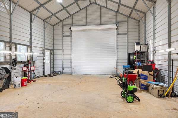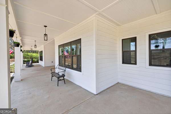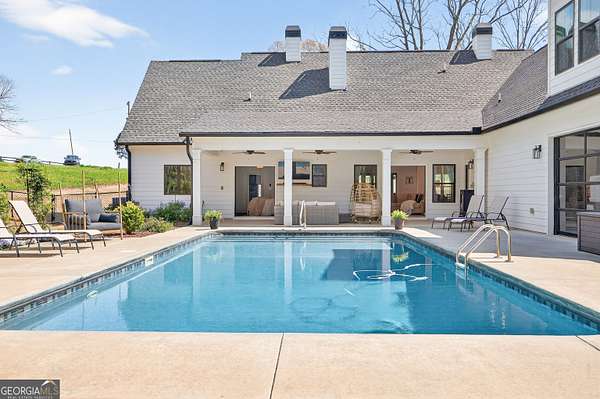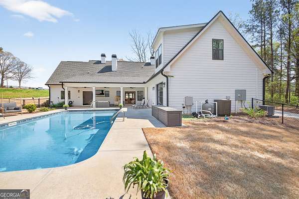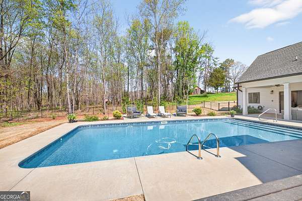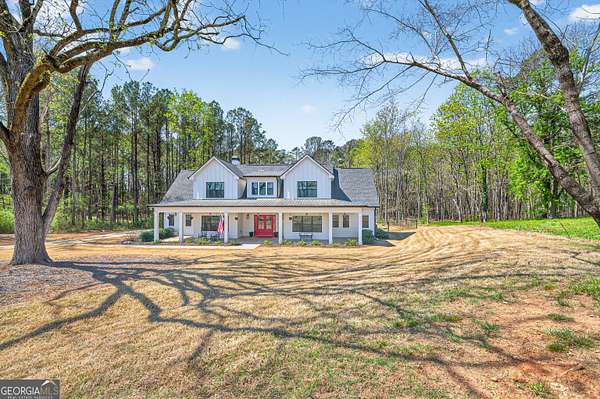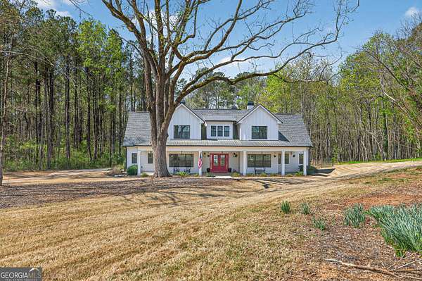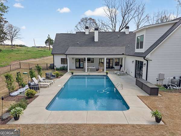 Finding a private estate that balances high-end architectural design with the expansive freedom of a rural landscape in Monroe, Georgia, often forces a choice between modern luxury and homestead versatility. This property serves as the definitive solution, situated on two scenic acres of partially wooded, level land that offers a rare, non-HOA environment. Tucked away on a quiet street at 4746 Bentley Road, this masterpiece of modern design is located just ten minutes from the boutique shopping and family-owned dining of Bethlehem and the local stores of downtown Monroe. This residence provides immediate access to area landmarks like George Walton Academy and Monroe Area High School. The home's interior is a masterclass in open-concept living, centered around a light-filled great room featuring a floor-to-ceiling brick fireplace with a reclaimed timber mantel and custom shiplap accents. The great room opens to a chef's kitchen, perfect for hosting gatherings of any size, and showcases white shaker cabinetry, champagne gold hardware, and a professional-grade island with a dark, textured countertop. The main level is thoughtfully designed for longevity and flow, featuring a dedicated home office, a mudroom, and a primary suite that serves as a true sanctuary. This primary suite features direct access to the outdoor living area and a spa-like bathroom with a soaking tub and walk-in shower. Outdoor amenities define the exterior experience, featuring an in-ground saltwater pool surrounded by generous front and rear porches that create a premier environment for entertaining. An oversized detached workshop and garage includes both power and water, offering an ideal space for automotive pursuits, RV storage, or DIY projects. This Royal Oaks Design floor plan maximizes natural light through black-framed French doors and features modern tray ceilings, a playroom, and a large upper-level loft. Whether enjoying the sunrises over the neighboring tree farm or exploring the balance of grassy openness and natural woods, this property offers the privacy you crave without sacrificing convenience.