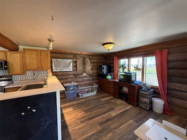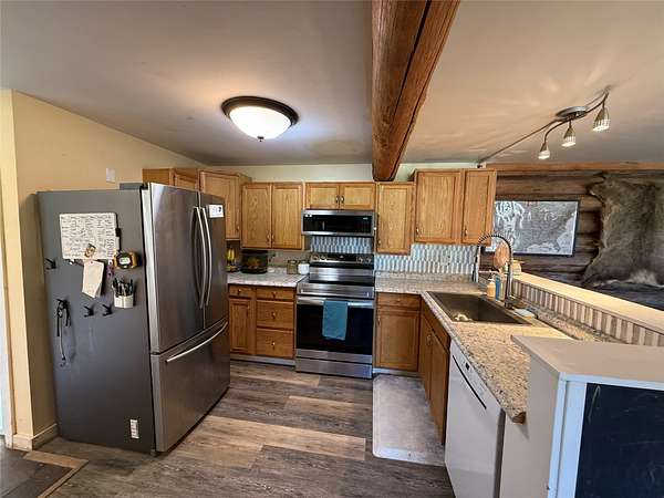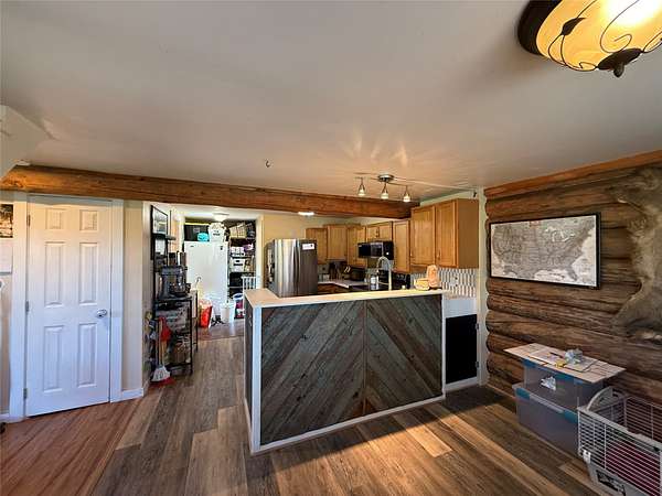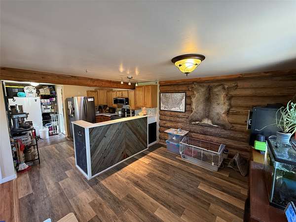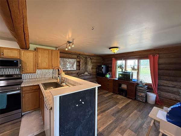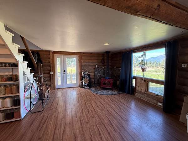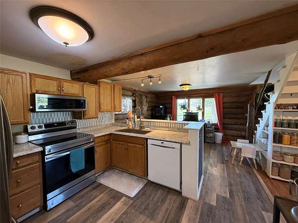 A 1,560-square-foot log home situated on 1.62 acres, offering beautiful mountain views. 4-bedroom, 1.5-bath cozy home with laminate flooring, stainless steel appliances, and lots of hidden storage cubbies throughout. The half bath/laundry is on the main level, along with the living areas. Upstairs, you will find the four bedrooms and a fully updated bath. Outside, there is ample space for your pets or toys, featuring a detached double garage and greenhouse and chicken coop.