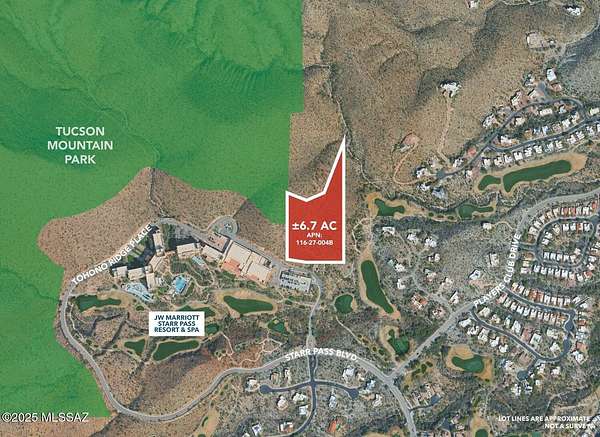 Perched high above the prestigious Starr Pass resort community, this rare 6.6-acre hilltop parcel offers one of Tucson's most spectacular custom home settings. Once part of a historic mining claim, the property captures sweeping 360-degree views of the Tucson Mountains, sparkling city lights, the distant Catalina peaks, and the green fairways of the JW Marriott Starr Pass Golf Course. Located just outside the formal Starr Pass subdivision, this homesite comes with a distinct advantage - no HOA, no dues, and no restrictive CC&Rs. That freedom opens the door to greater architectural creativity, whether you envision a bold contemporary retreat or a design that blends seamlessly with the surrounding desert. For those seeking even more space, the adjacent 6.6 acres are also available, creating a combined 13-acre opportunity. This is the highest homesite in the area, set directly across from the JW Marriott Resort & Spa. Towering saguaros and native desert flora create a pristine, natural backdrop, perfect for a signature luxury residence or the potential to split into multiple homesites. Optional resort memberships offer access to world-class golf, a luxury spa, fine dining, and fitness facilities. Bordering over 60,000 acres of protected parkland in Tucson Mountain Park and Saguaro National Park, the location is a paradise for hikers, bikers, and nature lovers. Despite its privacy, it's only minutes from Downtown Tucson, Mercado San Agustin, the University of Arizona, I-10, the airport, and major employers such as Caterpillar, Raytheon, and St. Mary's Hospital. Surrounded by high-end custom homes yet free from subdivision restrictions, this property delivers both exclusivity and flexibility a rare combination in one of Tucson's most sought-after resort areas. It's more than a homesite; it's a legacy property ready for a vision as exceptional as its views.