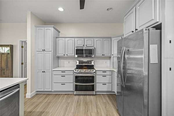- Built-In Features, Ceiling Fans(s), Eat-In Kitchen, High Ceilings, Open Floorplan, Solid Surface Counters, Solid Wood Cabinets, Split Bedroom, Thermostat, Vaulted Ceiling(s), Walk-In Closet(s), Window Treatments