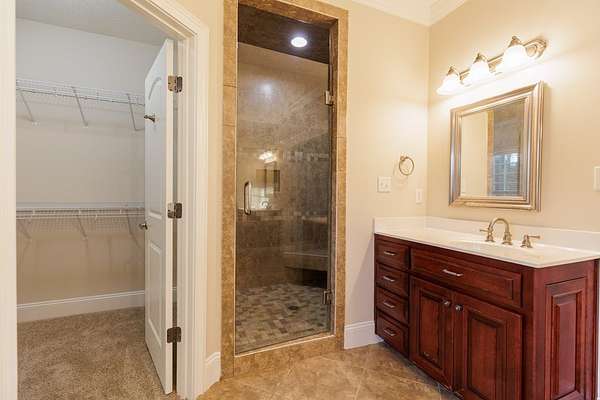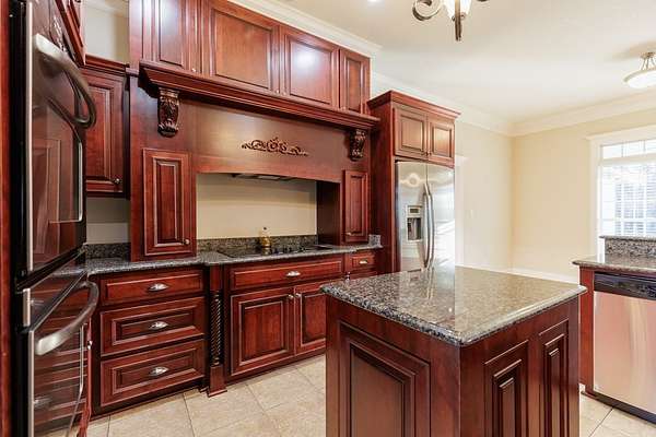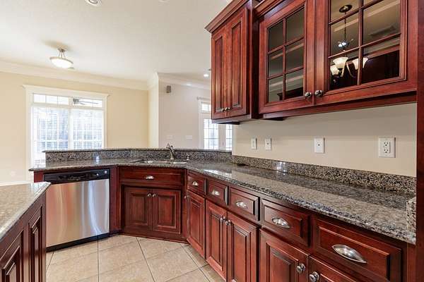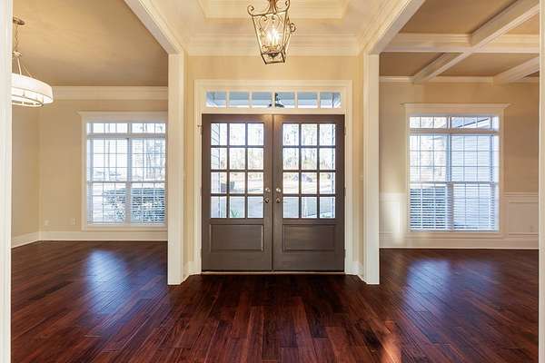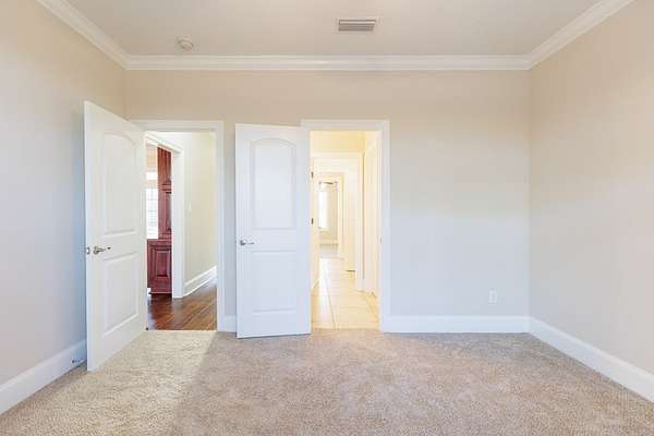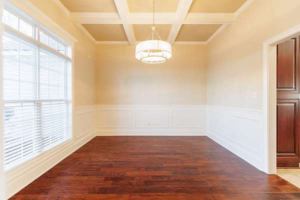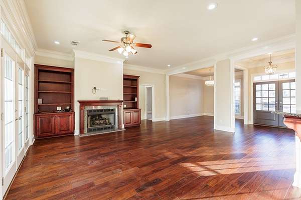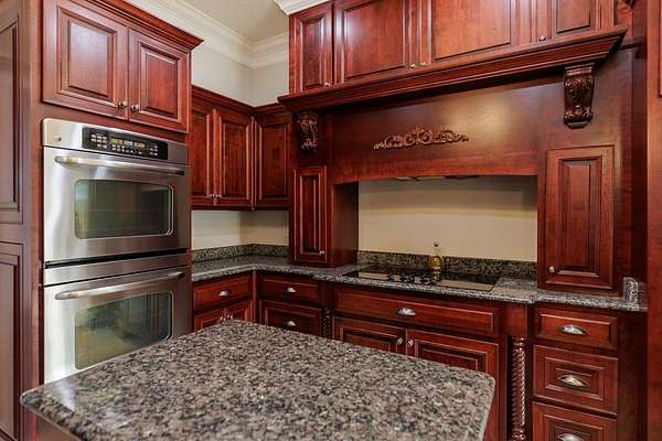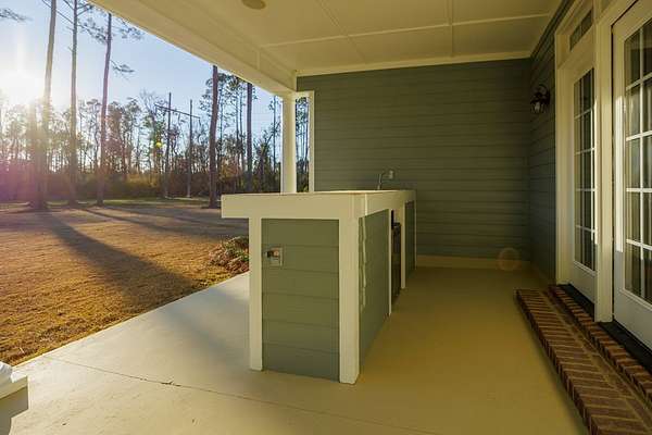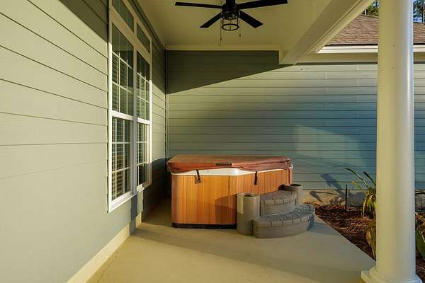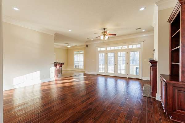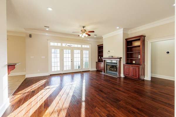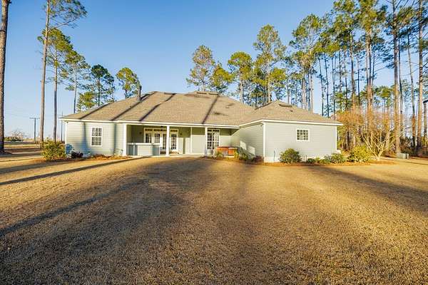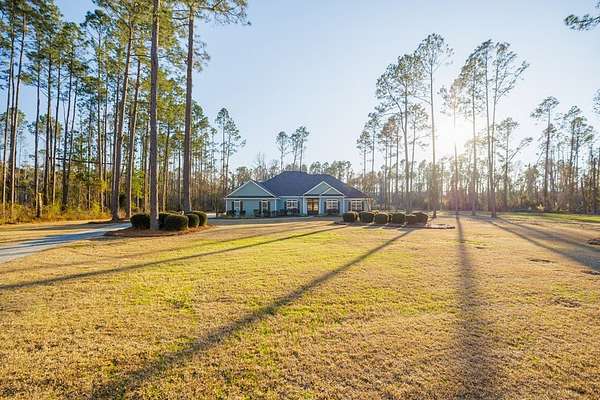 Located in Kings Gate Subdivision - Phase 3, this beautifully updated 3-bedroom, 2.5-bath home sits on a private 2.5-acre lot and offers an exceptional blend of space, privacy, and quality finishes--just 3 miles from Moody Air Force Base. As you enter the home, you are greeted by hand-scraped hardwood flooring throughout the foyer, living room, formal dining room, and office/flex space. The living room has built-in cabinetry on each side of the gas-log fireplace, and is wired for surround sound, creating a warm and functional gathering space. The kitchen offers granite countertops, custom cabinetry, stainless steel appliances which consist of a surface cooktop, double wall oven, refrigerator and dishwasher, and a comfortable eat-in breakfast area, making it ideal for both everyday living and entertaining. The spacious primary suite features a large bedroom and a well-appointed bath with dual separate vanities, a tiled shower, a jetted tub, and two walk-in closets. Guest bedrooms are thoughtfully positioned on the opposite side of the home and share a highly functional Jack-and-Jill bathroom, complete with separate vanities, private access from each bedroom, and individual closets, offering both privacy and convenience. An additional office/flex room provides excellent versatility and could easily be converted into a fourth bedroom if needed. Recent updates include new carpet, fresh interior and exterior painting, and new landscaping, enhancing both comfort and curb appeal. Step outside to the covered back porch where you'll find a built-in bar with sink, mini-refrigerator, and a hot tub--the perfect setting to relax and enjoy the abundant wildlife. The rear of the property borders Grand Bay Wildlife Management Area, providing exceptional privacy and a true natural backdrop rarely found in a residential setting. The oversized 31' x 23.5' garage offers plenty of room for two vehicles plus a golf cart or additional storage. This is truly a one-of-a-kind property!