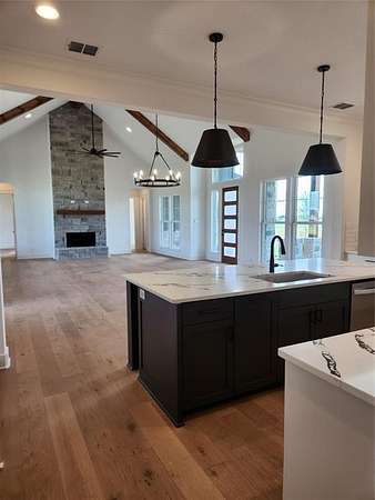 This Open Concept floor plan has vaulted ceilings with Stained Beams and a beautiful floor to ceiling Stoned Gas Fireplace. 8' designer Entry Door. The Family Room and Dining areas are combined open spaces, great for entertaining. This Kitchen has an abundance of White Paint Grade cabinets with under cabinet lighting, Quartz counter tops, Subway tile backsplash and built-in Stainless-Steel Whirlpool Appliances. Appliances include Built in Microwave, Dishwasher, Vent-hood and 5 burner Slid-in Range. There is an oversized Island with stainless steel single undermount Trough sink that will serve as a wonderful space for Family Mealtimes. There are many added touches to our Kitchen cabinets being, Soft close doors and drawers with cabinet pulls and knobs, trash pull-out and drawer spaces. Moen Plumbing Fixtures in Matte Black. Matte Black Designer Light Fixtures. Ceiling Fans in Family Room, all bedrooms and back patio. There is an abundance of canned lighting throughout the home. The laundry room is conveniently located to all 3 Secondary bedrooms and has a folding counter and Laundry Sink. All Bathrooms have Designer Ceramic Tile and Quartz Countertops with Undermounts Sinks. Mudroom has a beautiful paint grade Mud-Bench and access to the laundry room and Garage. 8' Solid Core Doors throughout home.