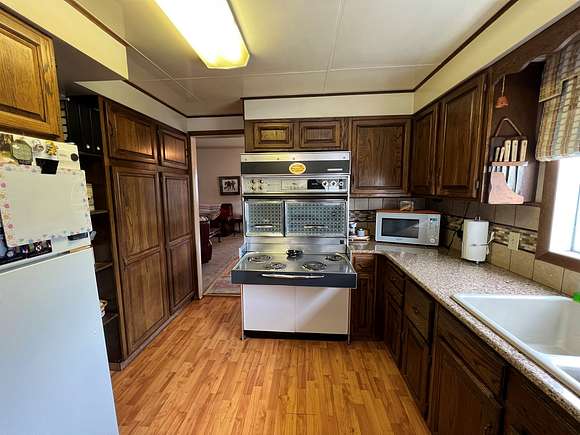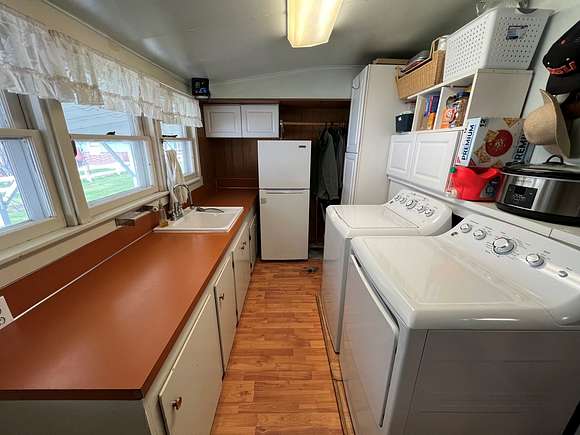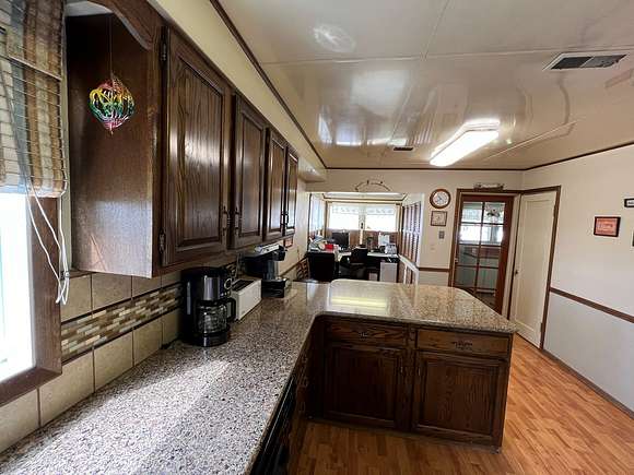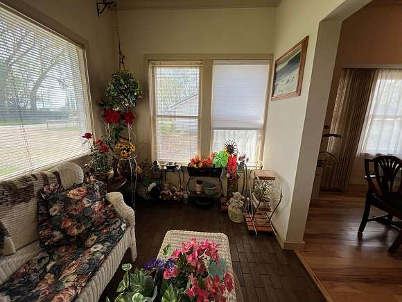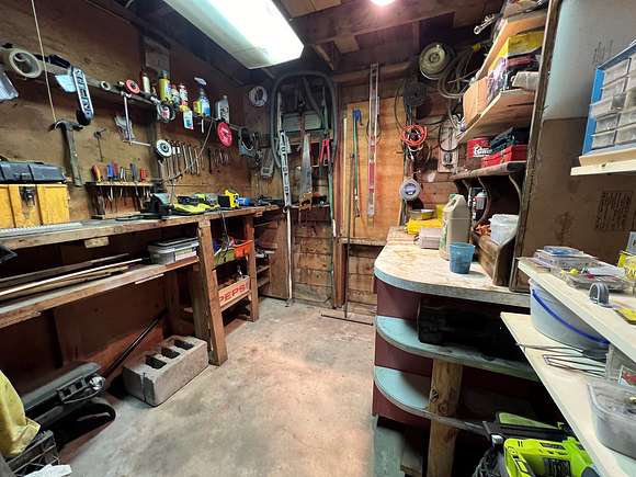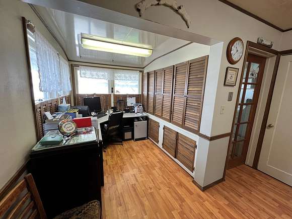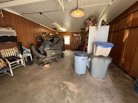 The secondary home, or casita, built circa 1920, offers 856 square feet of comfortable single-level living. It features a covered and screened front porch, oak wood flooring, a small bar area, and a functional kitchen with laminate flooring and wood cabinets. Two bedrooms and one bathroom provide practical accommodation, complemented by a laundry room with access to a covered backyard porch. The property includes two garages with power, one featuring three bays and ample storage, the other with a single bay and covered firewood storage. A greenhouse with water and power and a separate storage building enhance the utility of the property.