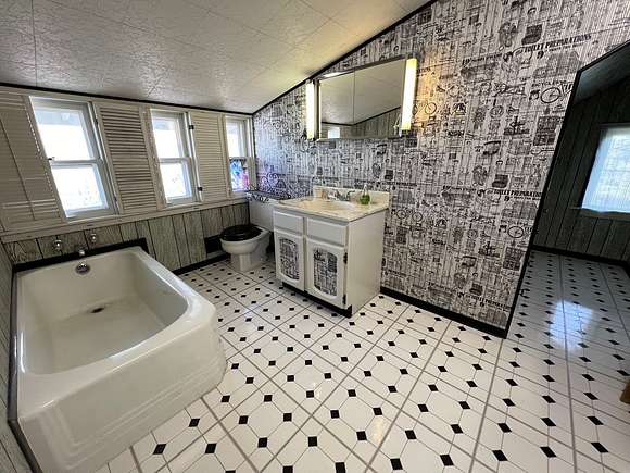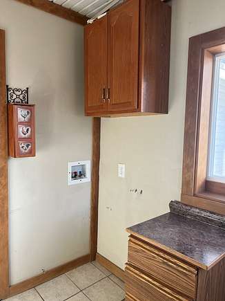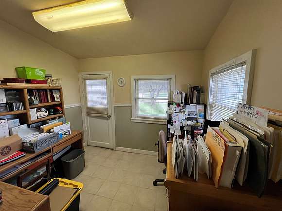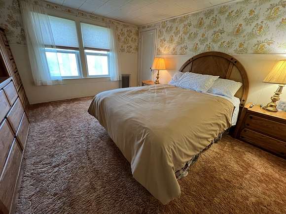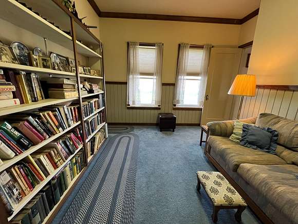 The primary home, built in 1919, encompasses approximately 2,322 square feet across one and a half stories. Upon entry, visitors are greeted by wood flooring, oversized wood-framed windows, and a covered porch. The living room features high ceilings, crown molding, a fireplace insert, and built-in custom wood cabinets, creating an inviting atmosphere. Adjacent is the dining area with Brazilian teak wood flooring and elegant finishes. The kitchen shines with granite countertops, custom tile backsplash, dual farm sink, and abundant cabinetry. Three bedrooms provide ample closet space, including cedar-lined closets for added luxury. Two bathrooms offer functional layouts with tile and linoleum flooring. Additional highlights include a wide staircase with built-in storage, a cozy office with electric floor heat, and a metal roof. While the wood siding requires painting, the home's character and solid foundation remain impressive.