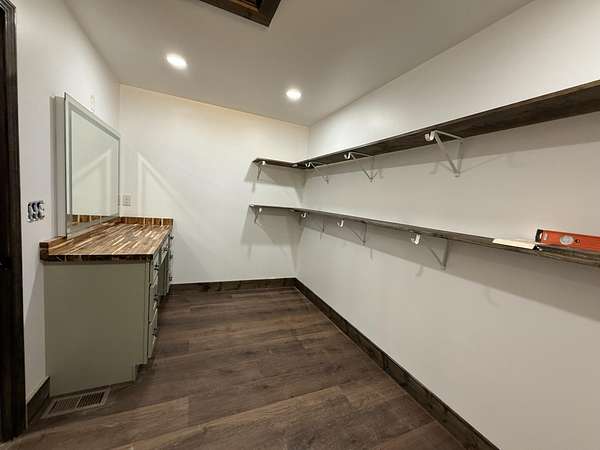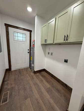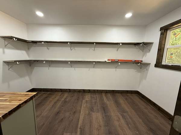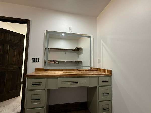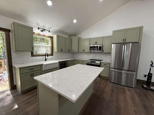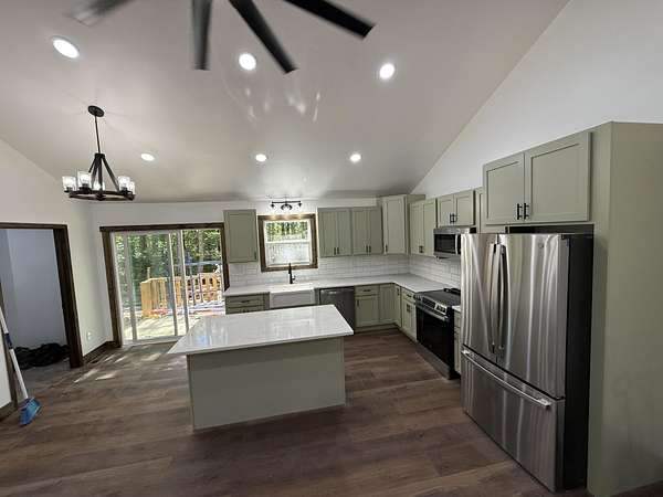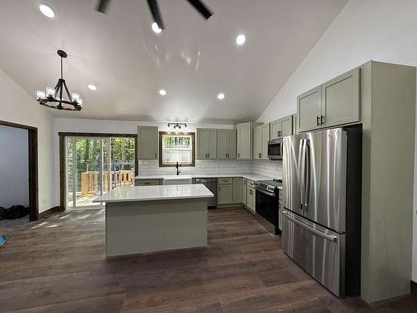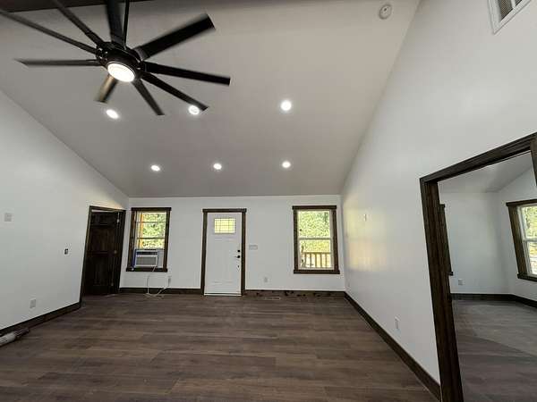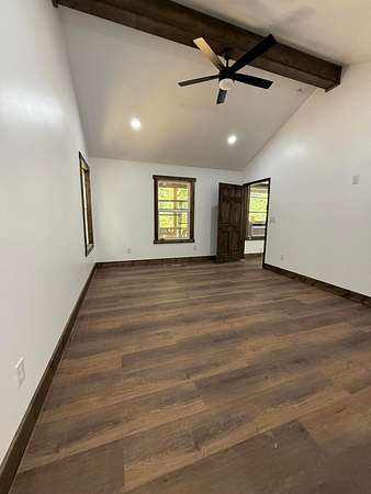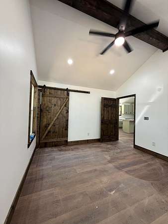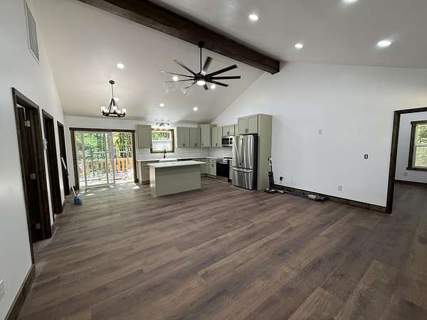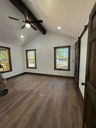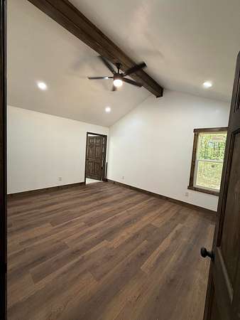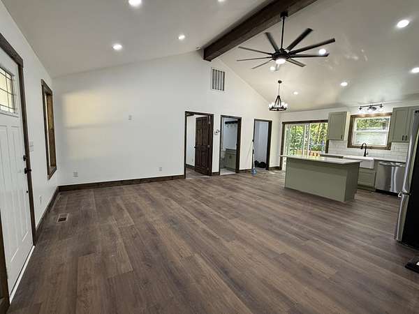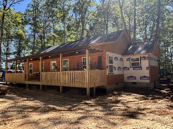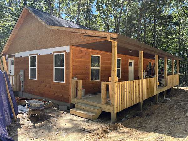 Welcome to your dream home--a stunning 2-bedroom, 2 bath sanctuary nestled approximately 400 feet off the road, offering unmatched privacy and tranquility. From the moment you arrive, the Dutch lap log siding and expansive front porch set the tone for rustic elegance and warm hospitality. Step inside to discover a show-stopping custom kitchen featuring rich green cabinetry, a farmhouse-style sink, and a layout designed for both beauty and function. A striking wooden beam runs seamlessly from the living room into the master suite, adding architectural character and cozy continuity. The master bath is a true retreat, boasting a luxurious soaker tub, double vanity, and a fully tiled shower with dual shower heads. The walk-in closet is oversized and thoughtfully designed with a built-in vanity table--perfect for your morning routine. Throughout the home, you'll find wood doors and handcrafted barn-style sliders that elevate the aesthetic. The living room features an extra-large ceiling fan for comfort and style, while a chandelier over the dining area adds a touch of elegance to every meal. This home is more than just beautiful--it's built for living well. Whether you're entertaining guests or enjoying a quiet evening on the porch, you'll appreciate the peace, privacy, and personality this property offers.