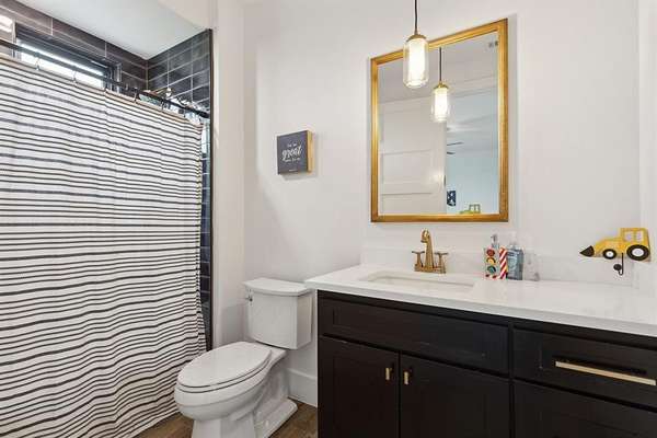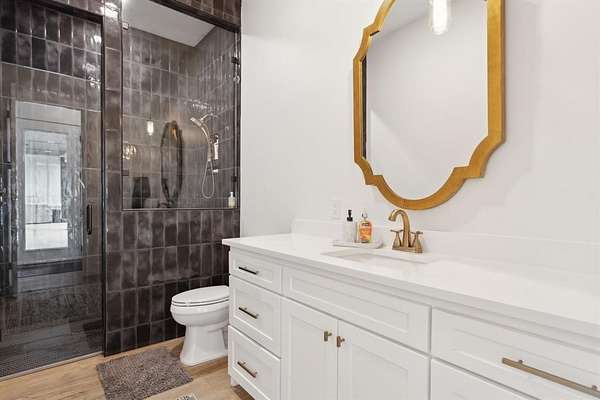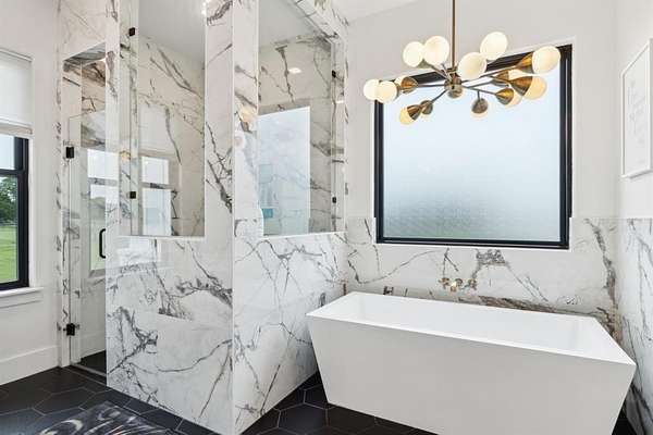 Inside, soaring ceilings and walls of windows flood the open-concept layout with light and volume. The gourmet kitchen is anchored by Taj Mahal quartzite countertops, premium KitchenAid appliances, a substantial island, and a walk-in pantry built for both weeknight dinners and weekend entertaining. The main-level primary suite offers dual vanities, a spa-inspired bath, and an expansive walk-in closet. Upstairs: three ensuite bedrooms and a flexible media or study room for family and guests alike.