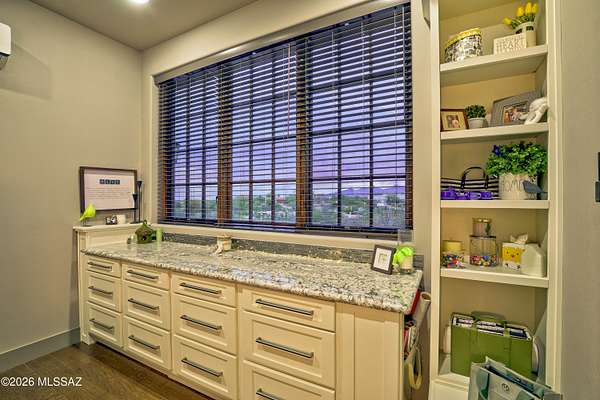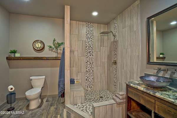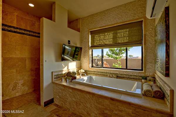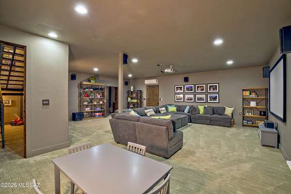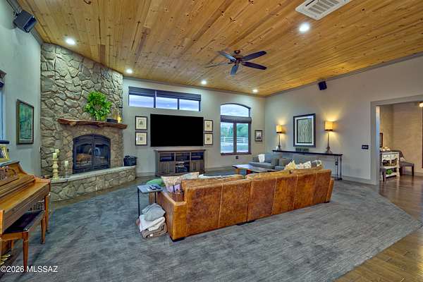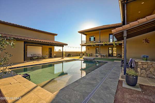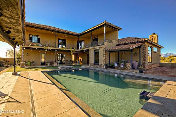 A Tucson Masterpiece: Hilltop Luxury with Unrivaled Views Perched majestically on 3.3 acres in the gated community overlooking the Sonoran Desert, this hilltop estate is a rare Southern Arizona jewel, offering over 5,000 sq ft of sophisticated living space and 360 degrees panoramic vistas of the Catalina and Rincon Mountains, Tucson city lights, and the protected lands of Saguaro National Monument East. Every sunrise and sunset becomes a private spectacle in this serene desert sanctuary. Crafted with steel-frame construction and powered by an owned solar system, the home blends modern sustainability with timeless Southwestern strength. Two stories plus a fully finished basement including a full bathroom and storage room are seamlessly connected by a custom wrought-iron staircase with stone and mesquite inlaid steps, ascends to the dramatic focal point: the most majestic circular chandelier you'll ever see, illuminating the heart of this exceptional estate. The gourmet kitchen is a chef's dream, featuring custom cabinetry, granite countertops, high-end appliances and a huge granite island perfect for entertaining. A secondary butler's kitchen includes a double oven, farm sink, and oversized refrigerator/freezer, offering both functionality and elegance for large gatherings. The living area showcases breathtaking views and a custom stacked stone fireplace, creating a cozy and dramatic focal point for cool desert nights and intimate gatherings. The Primary suite, occupying the entire second floor, is a sky-loft retreat with sweeping views in every direction. It features his-and-her offices and a spa-inspired Primary bathroom with a custom stone soaking tub, walk-in granite rainfall shower, and spacious walk-in closet. A full-length private balcony stretches across the entire suite, offering unparalleled views of the Rincon Mountainsthe perfect place to enjoy morning coffee or evening sunsets. The Guest suite, nestled under the master and connected via a charming breezeway, is a private oasis. Complete with a fireplace, luxurious soaking tub, walk-in shower, and walk-in closet, it provides comfort and privacy for family or guests. With double doors leading outside, it's just steps away from the pool area. For the automotive enthusiast, the estate offers a 2-car attached garage, also, an enormous detached 8-car garage equipped with a car lift, a workshop, it's heated and cooled, a loft for extra storage or possibly another office space, 2 large garage doors in front and another in back for pull through capability. The detached garage also includes a workout room with a full bathroom and shower, providing convenient access for anyone enjoying the pool or the outdoor spaces. Step outside to your private desert resort: a sparkling pool with waterfall and resistance-current system, perfect for leisurely swims, fitness, or enjoying warm Arizona evenings under the stars. A state-of-the-art outdoor projector TV lets you watch your favorite team or movie from the pool, creating the ultimate desert entertainment experience. Entertaining, relaxing, and desert living all converge here in perfect harmony. This estate is a rare fusion of architectural artistry, luxurious amenities, and the unmatched natural magic of Southern Arizona. With its grandeur, privacy, and breathtaking setting, it stands as one of Tucson's most exceptional hilltop residencesan estate that must be experienced to be fully appreciated.