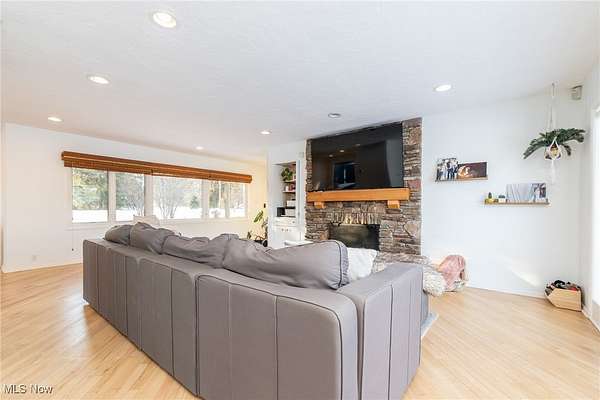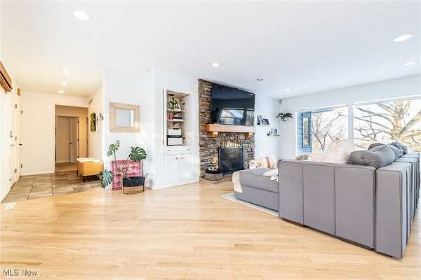 Enjoy the beauty of nature as it unfolds throughout the seasons in this spacious Ranch Home on 2 Acre Wooded Lot! Open Floor plan offers plenty of Natural Light throughout. Foyer with ceramic tile leads to Living room with hardwood floors, stacked stone hearth fireplace with built-in shelves and cupboards, and spectacular views of the grounds and pond. Dining room with hardwood floors and recessed lighting is in "L" shape with Living room for great entertaining flow. Eat-in Kitchen has newer Quartz counters and backsplash and Stainless Steel appliances, plus recently refinished cabinets and pantry. Family room off Living room is the perfect spot for reading or setting up a game table. Primary suite has amazingly updated (2025) spa bath with custom glass and tile double shower and two walk-in closets with organizing systems. Two additional large bedrooms, one with updated en-suite full bath with convenient shower over tub. Finished Lower Level has Rec room for media or play area, plus tons of extra storage. Courtyard off of Kitchen makes a great setting for outdoor dining, along with two level back Deck which leads to the yard! Total of 4 Garage Spaces! Exterior freshly painted in 2025. Award winning Orange Schools! Don't miss this exceptional home!