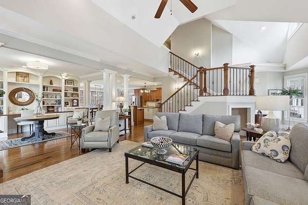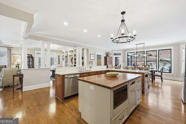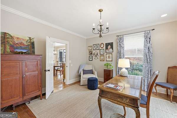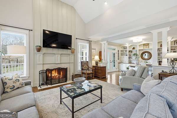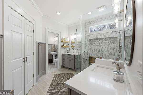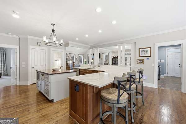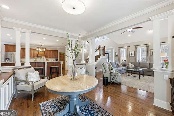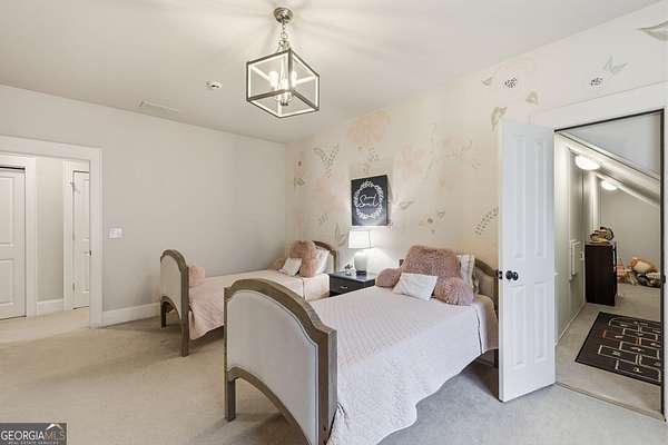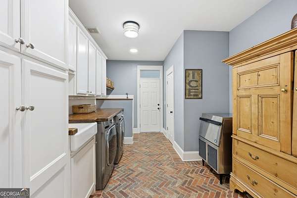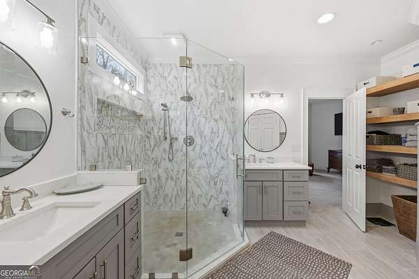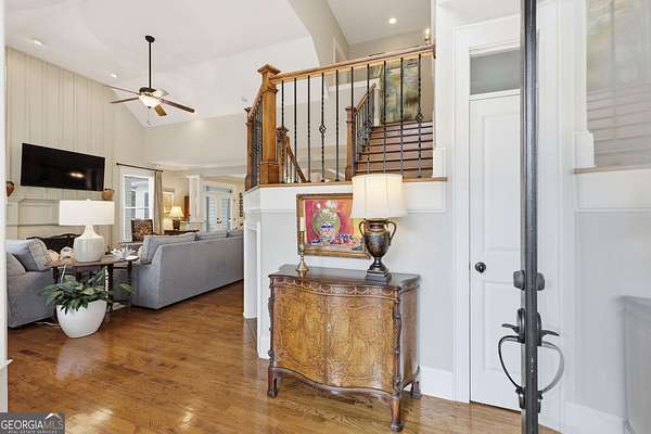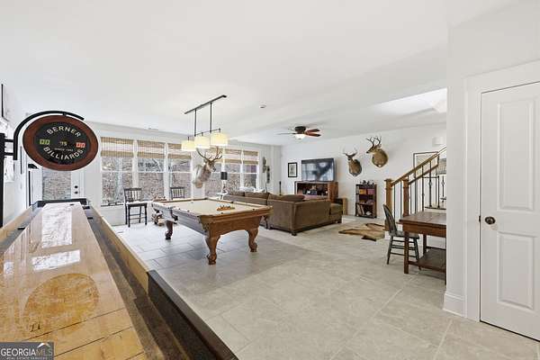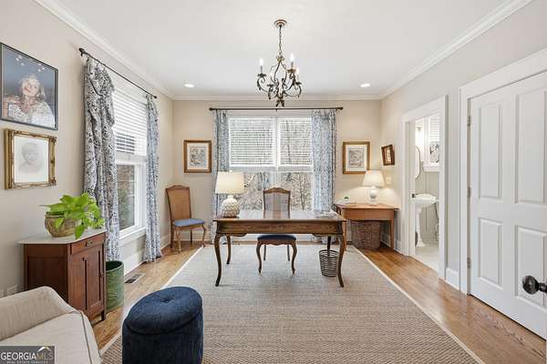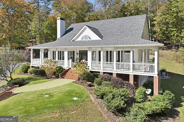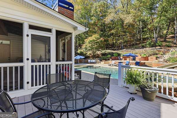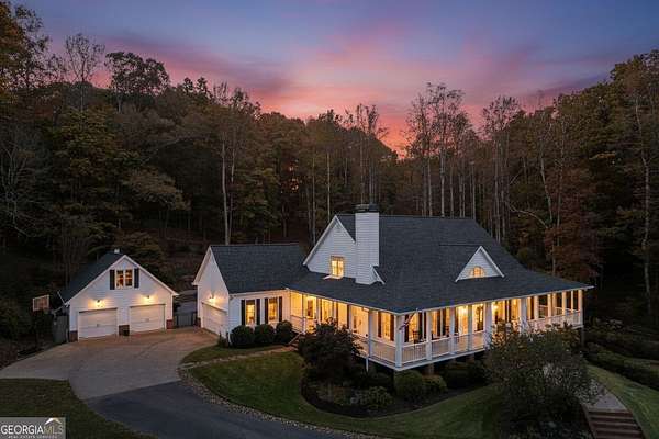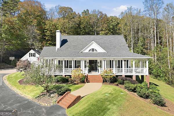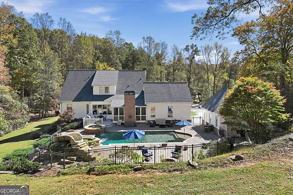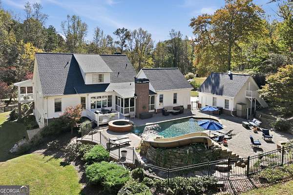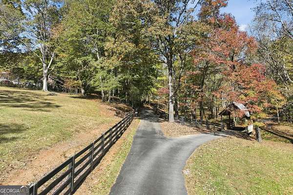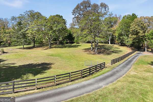 This impressive property spans more than 10.5 acres, includes a creek, and a beautiful home in the sought-after North Hall area. Well-suited for equestrian activities, it features a former sand arena. Looking for a gentleman's farm? There is a fenced garden area, a fenced chicken coop, with room to expand and build a barn, with unlimited possibilities. The long, tree-lined driveway leads to a residence distinguished by its expansive front porch, ideal for relaxation at any time of day. Inside, the home includes a light filled, spacious open floor plan, refined hardwood flooring throughout, and a thoughtfully designed area under the stairs with a brick floor suitable for pets. The inviting living room with a wood-burning fireplace connects to a flexible library and bright office, both with custom cabinetry and French doors to the porch. The dining area leads to a chef's kitchen equipped with a 4-burner gas stove, stainless steel appliances, two prep areas, two pantries, ample storage, and a Taj Mahal quartzite island overlooking the deck, heated salt water pool and spa, and backyard. A screened porch with a wood ceiling, stone floor, and wood burning fireplace is easily accessible from the kitchen and breakfast area. Off the kitchen, the Mud/Laundry Room includes a dog wash, laundry sink, wood countertop, pull-out ironing board, lots of storage, a laundry chute for upstairs convenience, and a herringbone brick floor. The main floor also offers an extra bedroom or additional office space with a half bath. The spacious primary suite has a luxurious ensuite, remodeled in 2021, featuring his and her vanities, and a large shower. The upper level comprises three generously sized bedrooms. Two of these bedrooms are connected by a Jack and Jill bathroom, while the third offers an ensuite bath, a closet equipped with a laundry chute, a secondary closet, and access to partially floored storage space. The terrace level features a family room and game room area with a stone floor, and a fifth bedroom and bath. The additional areas can be customized into a secondary kitchen, room for an additional laundry, and living space to suit your needs for personal or generational living. Ample parking is available, along with an attached double car garage, and an additional detached double car garage with back stairs to storage area above, and a workroom. The heated, salt water pool and spa provides an ideal setting for hosting guests of all ages. From the pool slide to the expansive pool patio featuring multiple, terraced areas enhanced with brick and stone, all combine to offer spaces for sunbathing, dining, and relaxing. There are many opportunities for creek-side walks, extended hikes, ATV use, wildlife observation, and serene privacy. The site features multiple gated entrances for secure access, two fenced pastures, each equipped with gates, a utility shed, chicken coop, and garden, all enhancing the natural wooded surroundings. These amenities collectively provide a sophisticated blend of town and country living, suitable for hosting social events and creating lasting family enjoyment. Call today to schedule your private tour of this exceptional property!