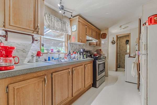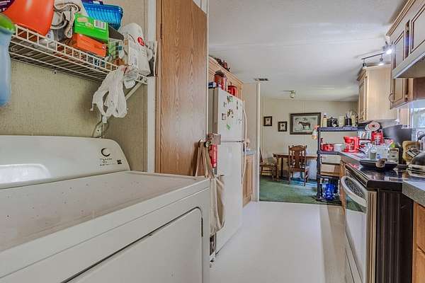 - Electric Range, Kitchen/Dining Combo, Laminate Counter, Laundry/Utility Room, Living Room, Open Floor Plan, Wood Cabinets, w/ Hookups