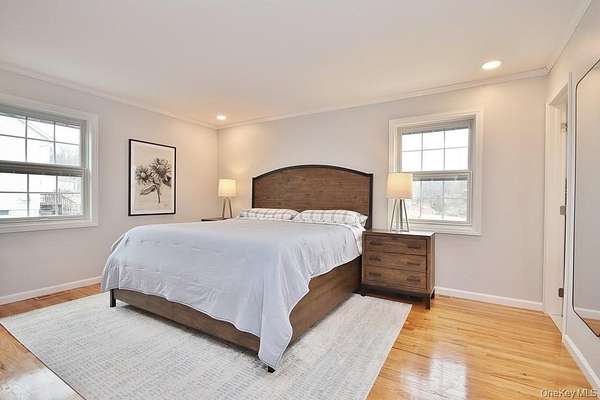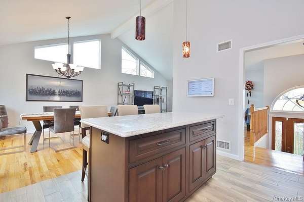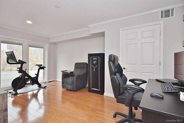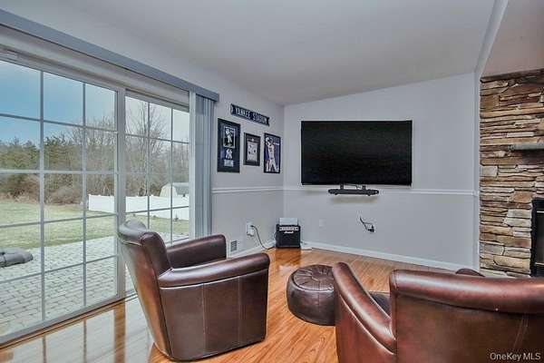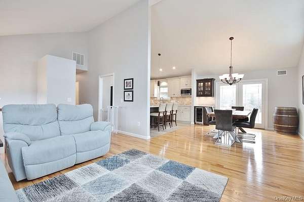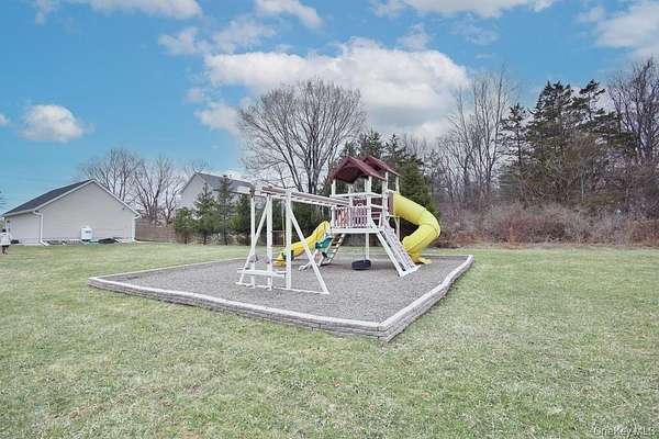 Set on more than two cleared acres in the Washingtonville School District, this meticulously maintained contemporary home offers soaring cathedral ceilings, abundant natural light, and an open layout that feels both expansive and comfortable. Built in 2000, the home blends modern construction with warm finishes like hardwood floors and a beautifully integrated living, dining, and kitchen space that flows effortlessly for everyday living. Open-concept living, dining, and kitchen areas create a seamless flow that feels both expansive and comfortable. Large windows and ceiling height bring a sense of calm and openness, making the home equally suited for entertaining or quiet evenings in. The kitchen is equipped with high-end appliances, including a beautiful range and wine fridge, and opens directly to the main living space for easy everyday living. The primary bedroom is generously sized-large enough for a king bed-and features a built-in closet system for organized storage. Two additional bedrooms and baths complete the main level, along with a dedicated first-floor laundry room and ground-level entry access for added convenience and accessibility. Downstairs, a substantial bonus space offers flexibility for a home office, gym, playroom, or media room. The home is equipped with multi-zone central air conditioning, ensuring year-round comfort. Outside, the property truly stands out. The open acreage provides room to garden, grow flowers or vegetables, play, relax, or host that Thanksgiving backyard football game. A full playset is already in place with swings and a slide, along with a patio for outdoor dining and relaxation all summer long. The heated three-car garage offers excellent storage and could easily double as a workout or hobby space, while the driveway accommodates up to 10 vehicles. Location adds even more appeal. You're just 7 minutes to Stewart International Airport and Stewart Air National Guard Base, approximately 25 minutes to West Point, and close to I-87 for easy commuting. The Five Corners in New Windsor offers convenient access to groceries, major chains and local dining, and daily essentials. Nearby are riverfront parks, yacht clubs in Cornwall and Newburgh, Bear Mountain State Park, golf courses, ski areas, orchards, farms, and the Beacon train station with service to NYC. Available July 1, this home offers space, light, and land in a highly convenient Hudson Valley location-an uncommon rental opportunity that balances privacy with accessibility.
