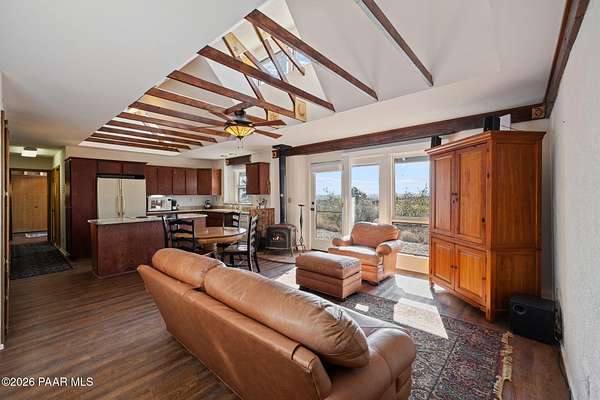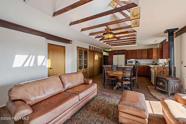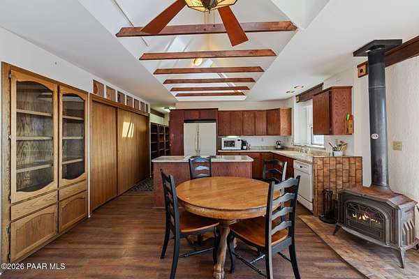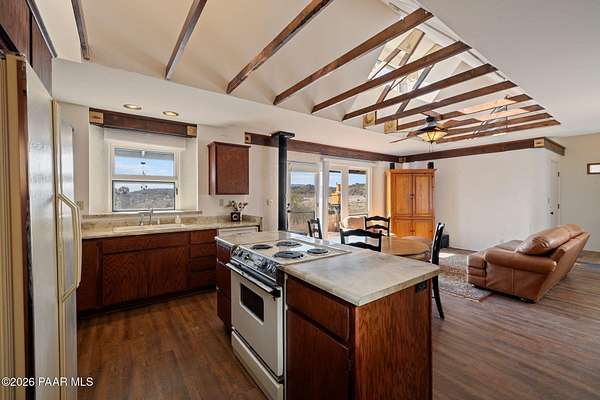 - Beamed Ceilings, Ceiling Fan(s), Eat-In Kitchen, Kit/Din Combo, Kitchen Island, Laminate Counters, Live On One Level, Master Downstairs, Vaulted Ceiling(s)
