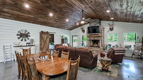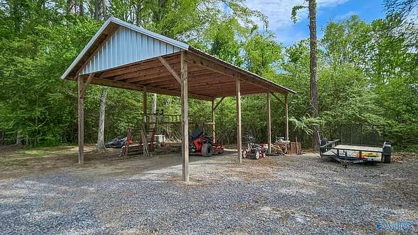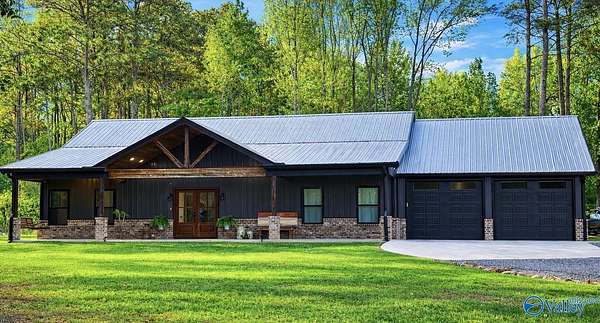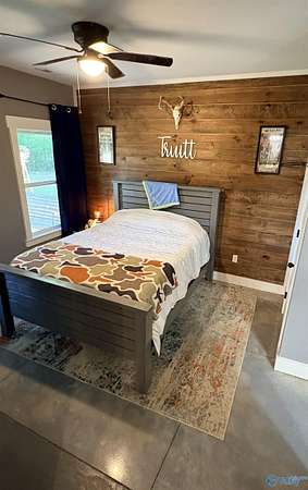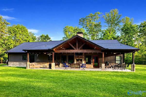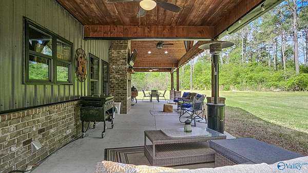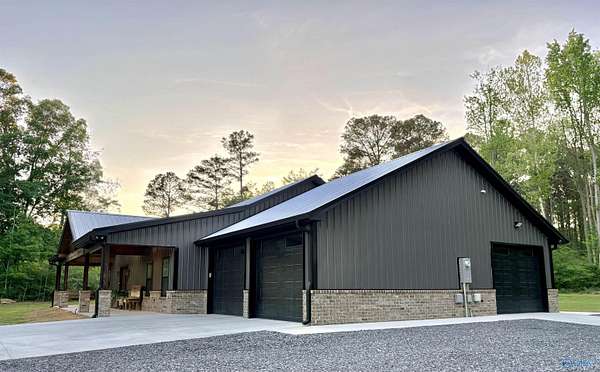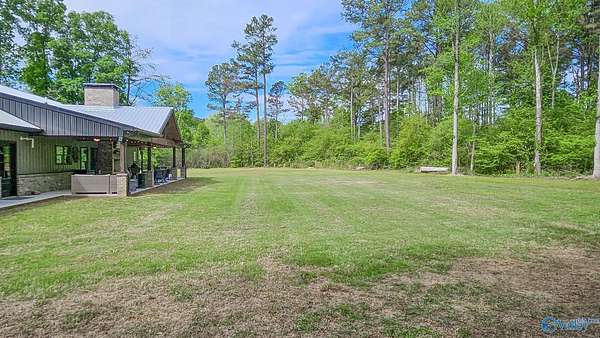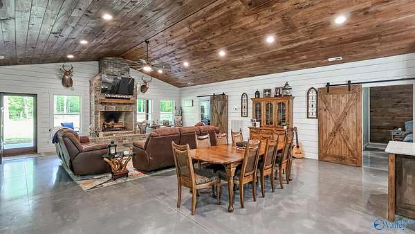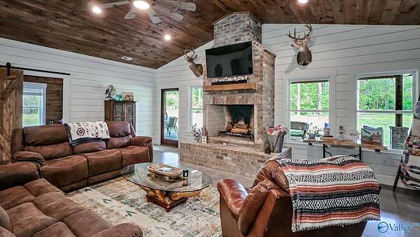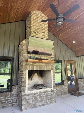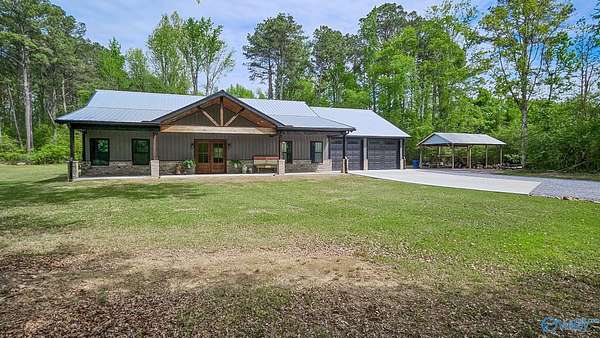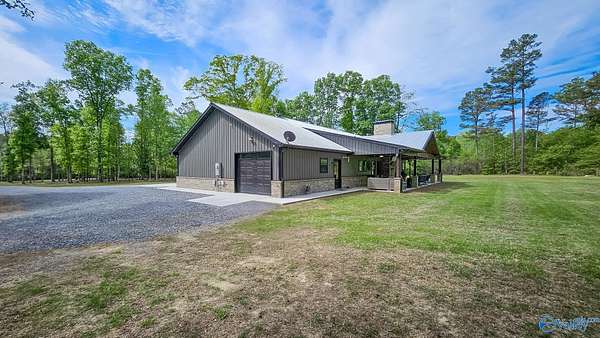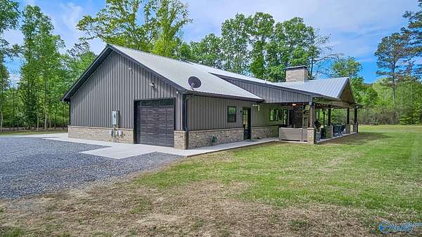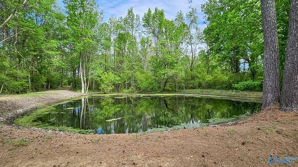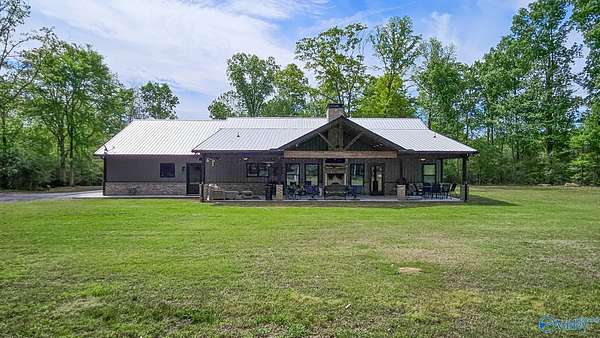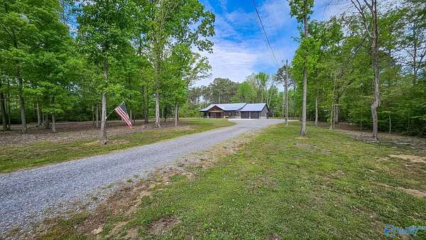 Home was featured in magazine after going viral. A custom built, one of a kind home w/3 BR & 2 1/2 bath, only 20 minutes from Huntsville situated on lush sod lawn surrounded by beautiful trees, plenty of privacy & a pond. Complete with 8+/- acres of land & green field w/trails for walking or riding on your side by side or ATV. Home has large indoor & outdoor brick fireplaces. Open concept, vaulted ceiling living area flows out to the 51'x12' back covered patio featuring 3 ceiling fans, natural gas hook up for grilling & room for your giant flat screen over the large outdoor fireplace- the perfect place for entertaining or to unwind. 26'x16' pole barn on quiet cul-de-sac. Handicap Accessible!