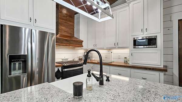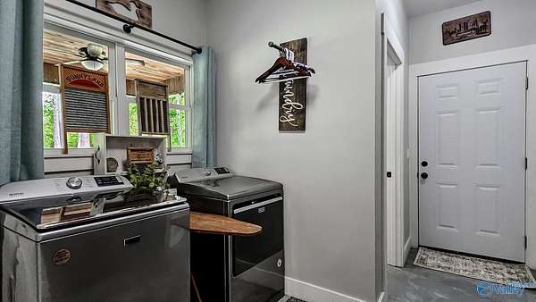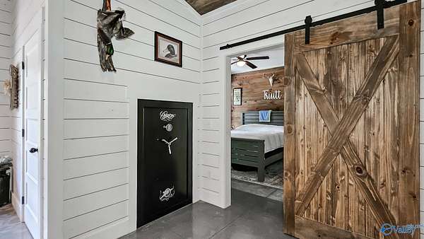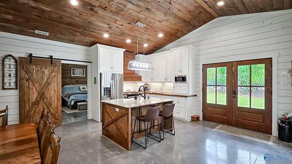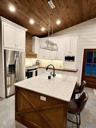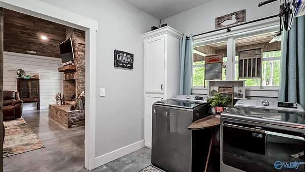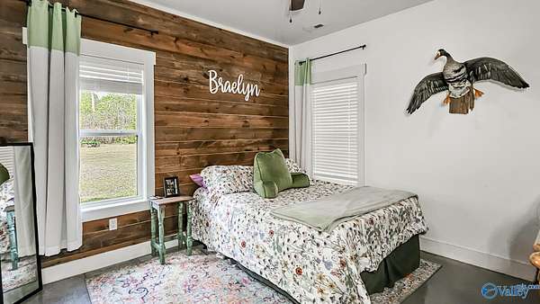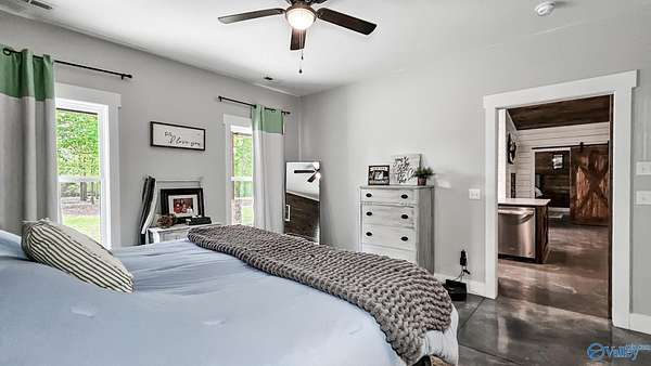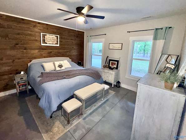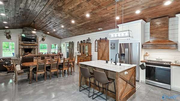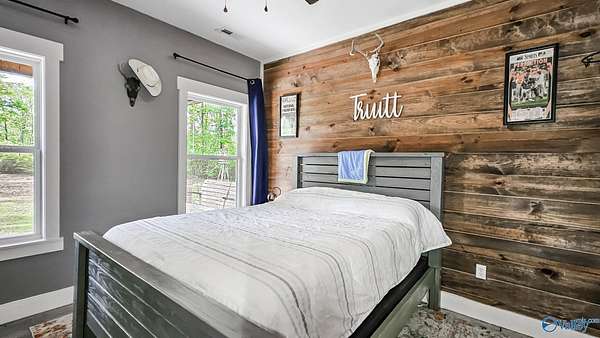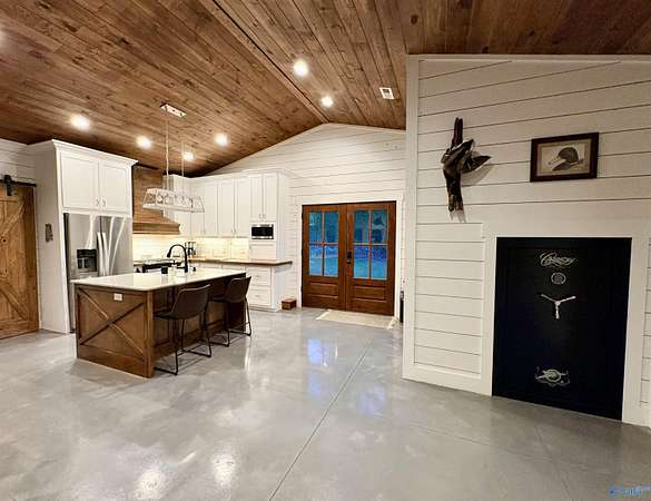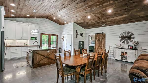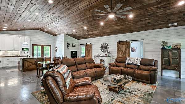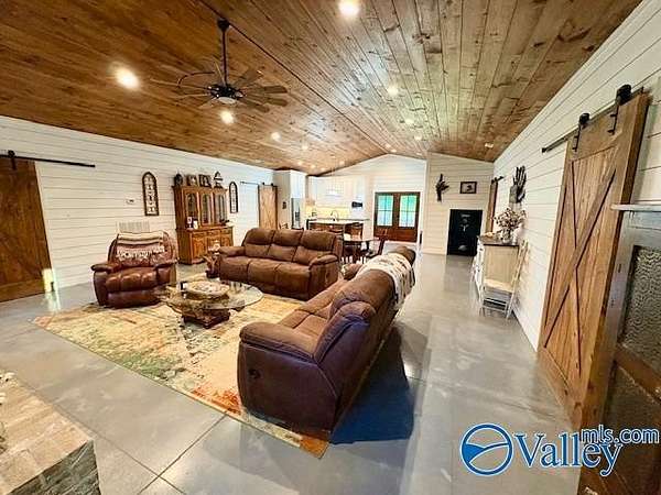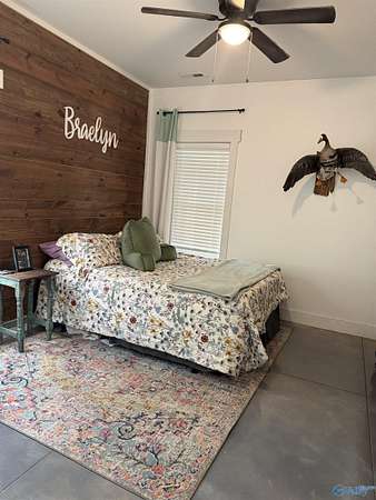 Home was featured in magazine after going viral. A custom built, one of a kind home w/3 BR & 2 1/2 bath, only 20 minutes from Huntsville situated on lush sod lawn surrounded by beautiful trees, plenty of privacy & a pond. Complete with 8+/- acres of land & green field w/trails for walking or riding on your side by side or ATV. Home has large indoor & outdoor brick fireplaces. Open concept, vaulted ceiling living area flows out to the 51'x12' back covered patio featuring 3 ceiling fans, natural gas hook up for grilling & room for your giant flat screen over the large outdoor fireplace- the perfect place for entertaining or to unwind. 26'x16' pole barn on quiet cul-de-sac. Handicap Accessible!