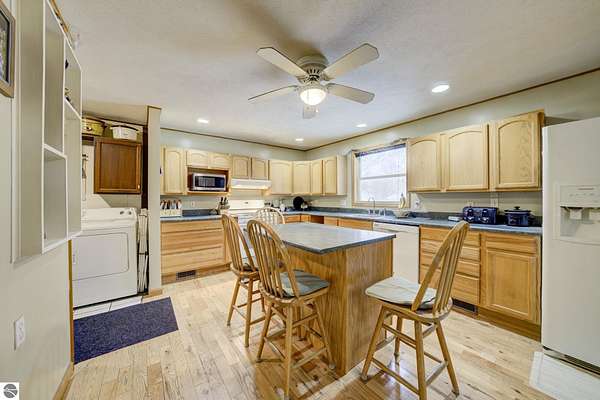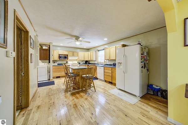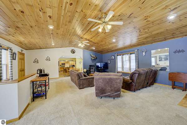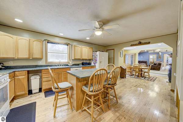 Expansive ranch style home offering 3 bedrooms and 2 baths, situated on 2.70 acres with Brigham Creek running through the backyard. Stepping through the front door you're greeted by the pine tongue and groove cathedral ceiling in the living room that draws your eye straight through to the dining and kitchen. Quite a lot of space to sprawl out. The kitchen has an island, a pantry, ample cupboard space and beautiful oak hardwood floors. The primary bedroom has the adjacent 3/4 bath and walk-in closet. The additional 2 bedrooms share the main full bath. The lower level is unfinished and offers egress windows and is plumbed for a bath for future build out offering space to add additional bedrooms and a rec-room. The 30x40 Pole Barn has 12ft ceilings, electricity and heat with room for extra vehicles and all those tools or off-road toys. This location is within the Kingsley School District.