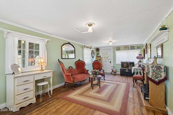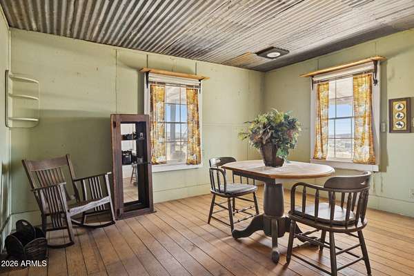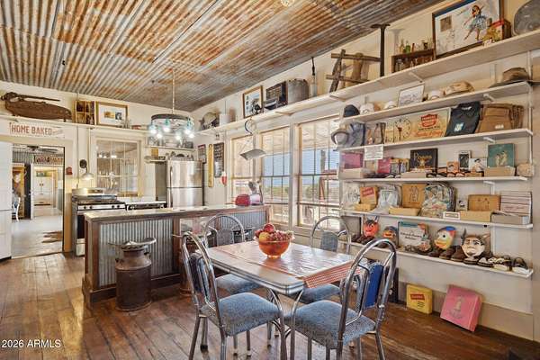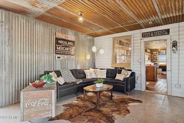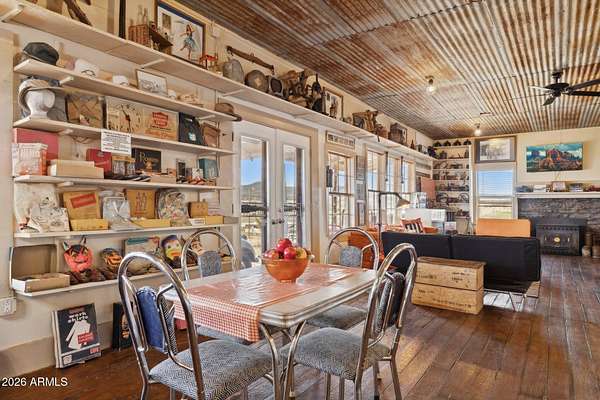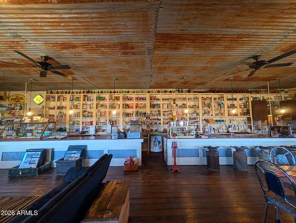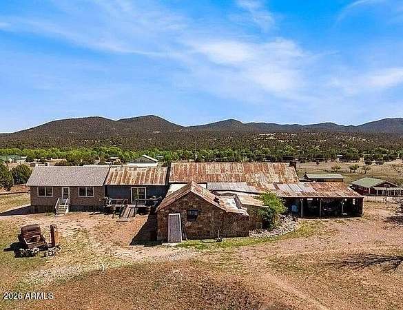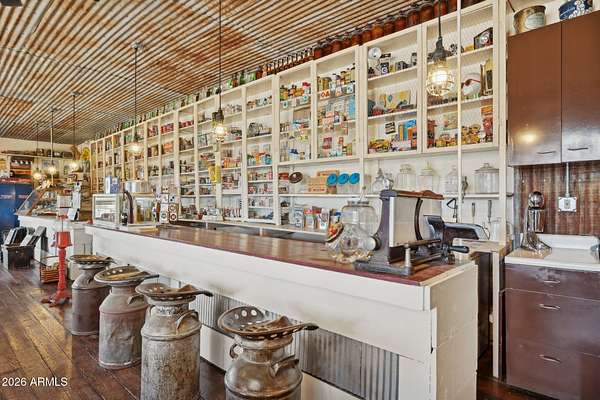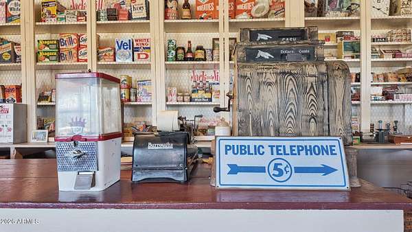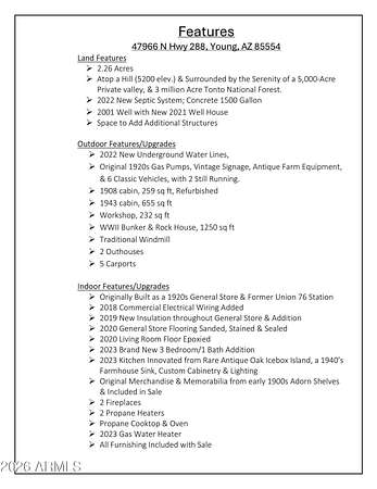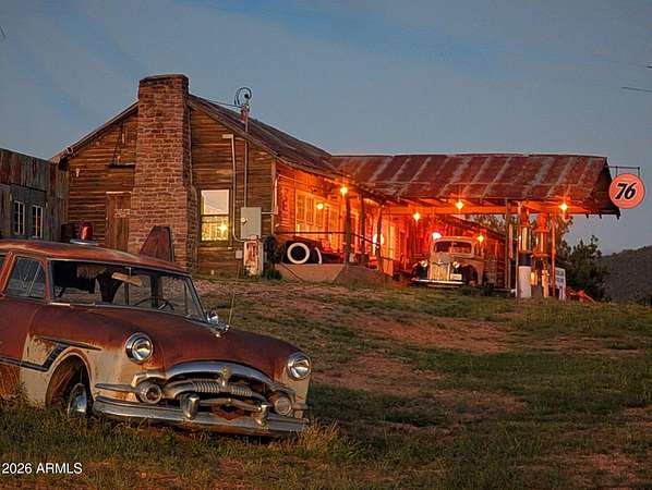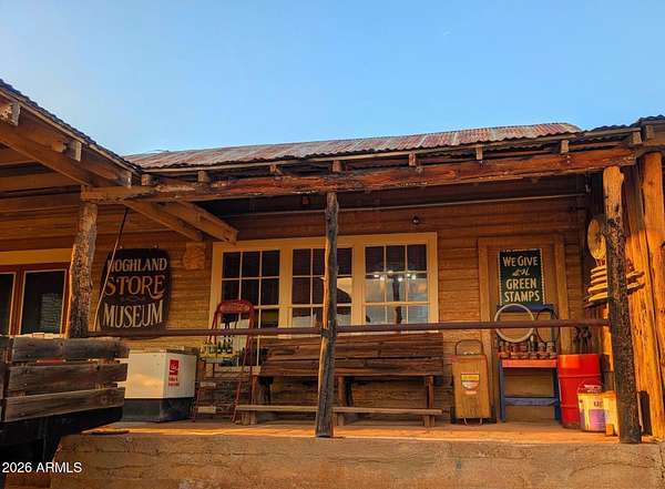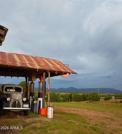 Once in a lifetime opportunity to own your own completely refurbished, fully stocked General Store with attached 3 bed/1 bath home. This hilltop site sitting on 2.26 acres has expansive views of the Mogollon Rim. Step into a truly one-of-a-kind property in Pleasant Valley where history lives & opportunity expands. Originally built in 1925 as a general store & later operating as a Union 76 station, this iconic structure has been thoughtfully preserved while integrating a newly built 3-bedroom, 1-bath addition completed in 2023. The property spans 2,471 sq ft & features fully updated commercial electrical, new insulation throughout, a new septic system, new underground water lines, & a new well house, offering modern infrastructure behind its historic walls. Inside, the kitchen is a conversation piece, anchored by a rare antique oak icebox island, a 1940s farmhouse sink, & custom cabinetry with curated lighting. The original store portion remains rich with character, with authentic early 1900s merchandise & memorabilia still lining the shelves. Two fireplaces & two living areas create flexibility for residential living, guest use, or future business concepts. Outside, the grounds are equally compelling, featuring original 1920s gas pumps, vintage signage, antique farm equipment, & six classic vehicles, two of which are operational, all included along with furnishings for a truly turnkey experience. Additional structures include a refurbished 1908 cabin, a 1943 cabin, a 1,250 square foot WWII bunker & rock house, a workshop, windmill, two outhouses, & four carports. Perched at 5,200 feet & surrounded by a 5,000-acre private valley & the 3 million-acre Tonto National Forest, fronting Hwy 288, "The Desert to the Tall Pines Scenic Byway", offers unmatched privacy, views, & potential for a boutique business, retreat, or legacy holding.