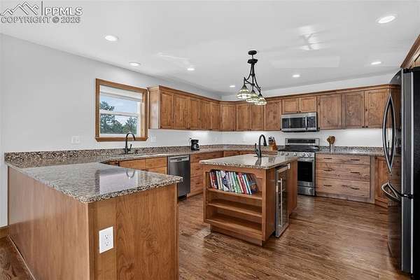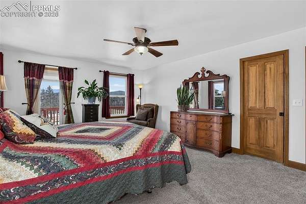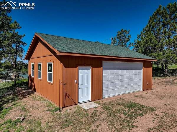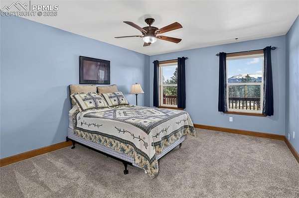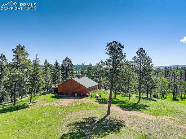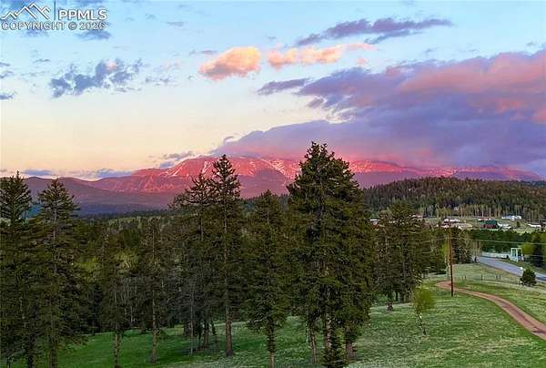 Welcome to your mountain dream home, where unobstructed Pikes Peak views greet you each morning, are visible through many windows and add a breathtaking inclusion to the spectacular sunrises in the morning. This spacious 4680 sq ft, 5-bedroom, 4-bathroom home, located in Divide Colorado, is nestled on a fenced-gated 38.68-acre property, where it provides the perfect blend of grassy meadow and heavily treed terrain with a creek that runs through and often draws the local wildlife to come visit. Inside this impressive home, you will discover a showstopping kitchen that would make any cooking enthusiast smile. Featuring gorgeous- engineered stone countertops, ample cabinets with soft close hinges and convenient pull-outs, a center island with a prep sink and beverage fridge, a walk-in pantry, and a convenient built in desk! Rich hardwood flooring flows throughout the main living areas, adding warmth and timeless elegance to this light and bright space. Generous sized bedrooms include walk-in closets, providing amazing storage options throughout. The primary bedroom includes a spacious en-suite bathroom with a tiled walk-in shower, bench seat and dual shower heads, a double vanity, an impressive walk-in closet and access out to the deck. The walkout lower-level houses a large office/multi use space, media room, and so much more. Outside, the large, covered deck and covered patio provide year-round enjoyment, whether you are sipping coffee with those jaw-dropping Pike's Peak views or watching wildlife wander through your meadow. The detached 2 car garage is oversized at 750 sq ft and your 1024 sq ft barn boasts a loft, concrete floors, a wood burning stove, three 220 outlets, and a lean-to for additional storage making it the perfect space for a workshop, your hobbies, or whatever your heart desires. Thoughtful improvements such as a generator interlock system at the pole located close to the propane tank make you prepared whatever the weather. This home truly has it all