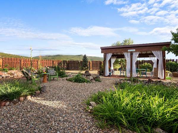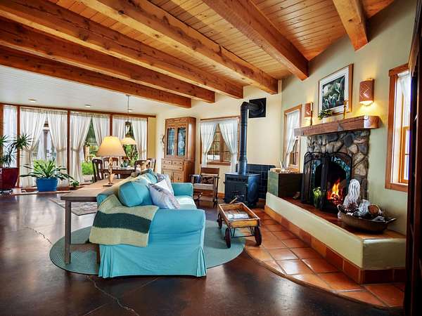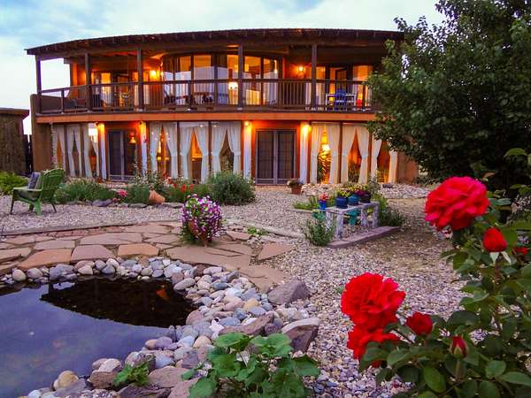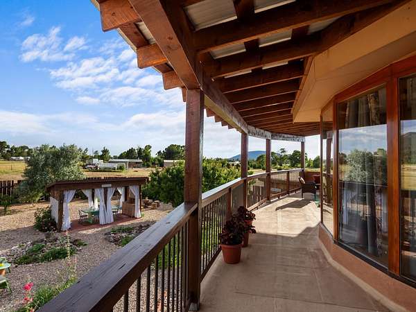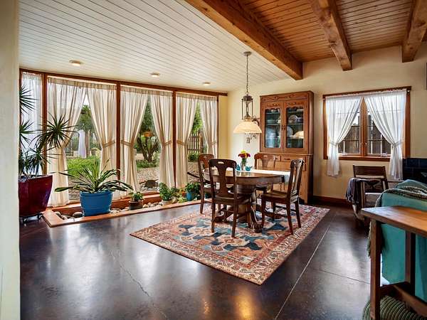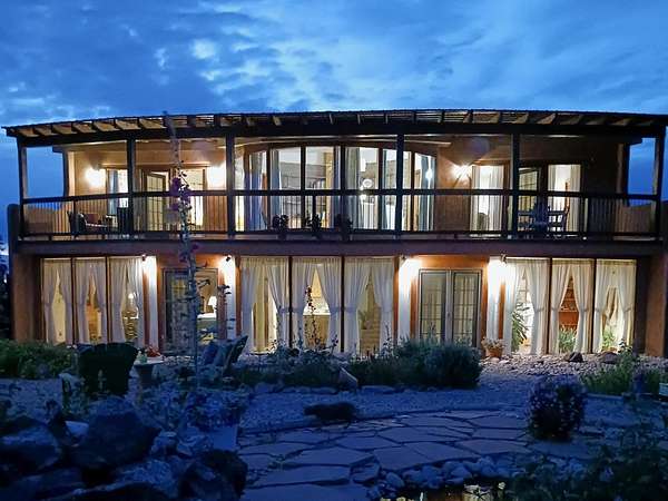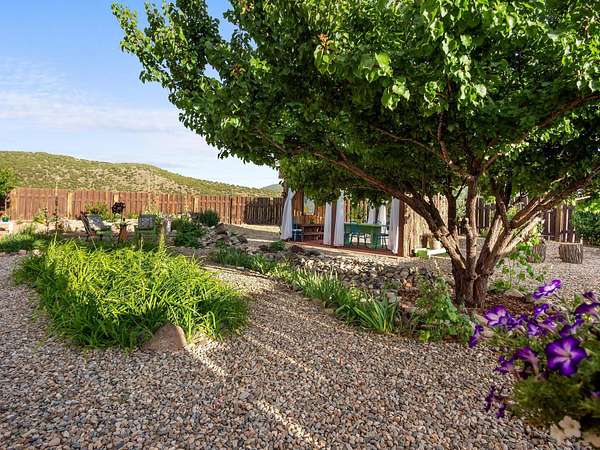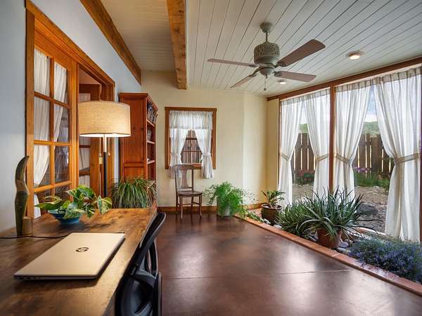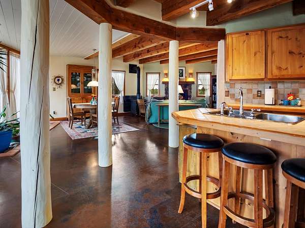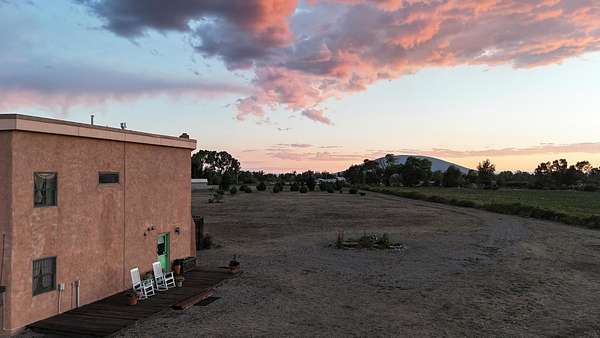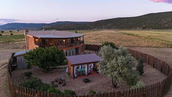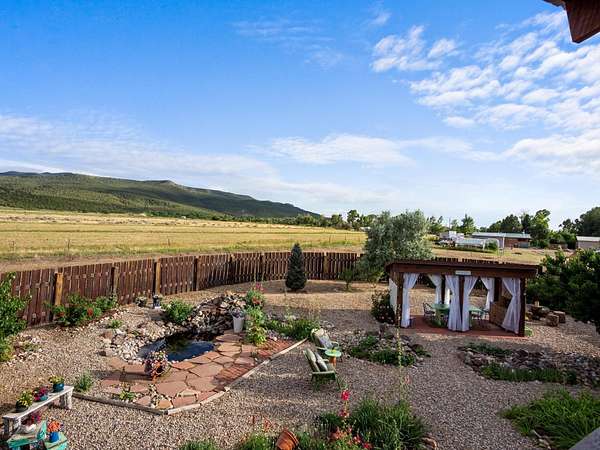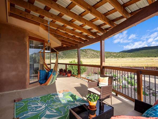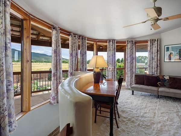 47B is located on The Poleo, the most desirable place in Costilla. One may walk down the road to trout fishing, or hunt elk and mule deer in the pasture. The 2484 square foot, two-story home is a well-functioning passive solar design, featuring a south-facing wall of floor-to-ceiling windows. The built-in planters, dark cement floors, and center adobe core collect heat during the day and release it at night. The windows are calibrated to facilitate solar gain through the seasons. This one-of-a-kind home features tongue and groove ceilings with exposed beams that add warmth and character throughout. The layout is part open-plan, with everything radiating from the circular kitchen at the heart of the home. The kitchen includes a newly updated gas range and stainless steel appliances. There are three bedrooms and two full bathrooms. The main floor includes a bedroom conveniently located next to the downstairs bath. Upstairs, a Jack and Jill bathroom with beautiful tile work and a jetted tub connects two additional bedrooms, along with a bright sunroom that opens to a full-length covered balcony with stunning views. Comfort is ensured year-round with two mini-split systems, as well as a wood-burning fireplace for cozy winter nights. The outdoor living area is just as special, featuring a fenced-in garden and yard space with a pergola-covered dining area-perfect for enjoying the fresh mountain air. The views from this property are truly outstanding in every direction. This property includes an expansive 18.47-acre parcel of lush pastureland bordering the Rio Costilla Cooperative Livestock Association (RCCLA), offering direct access to prime elk habitat. This unique property conveys with an existing elk hunting tag, making it an exceptional opportunity for sportsmen, ranchers, and conservation-minded buyers alike.