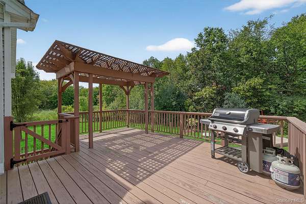 Out back, your private oasis awaits. Dive into summer fun with a large above-ground pool, surrounded by lush landscaping. Relax in the cozy sitting area under a charming Pergola, or host gatherings on the expansive deck, partly shaded by another elegant Pergola for those sunny afternoons.