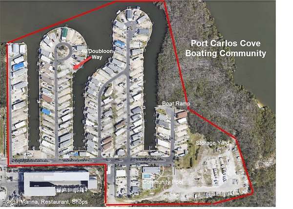 Welcome to Port Carlos Cove. Enjoy gorgeous waterfront views across the wide canal from your future home in Fort Myers Beach, FL. Enjoy the morning sunrises and shady afternoons from your deck overlooking the waterfront. Dock your boat behind your home and be in the Gulf in 15 minutes. It's just a 10-minute walk to white sand beaches and all the restaurants and shops. Fish from your dock or sit back and enjoy the dolphin. This beautiful waterfront lot is ready for your new construction. Public water/sewer and electric are at the property. Listing agent has complete details about the process and estimated costs of construction. We have included a photo of suggested future construction on the property. The first floor elevation is now required at approximately 11 feet above grade. That means extraordinary views and no flood insurance required. Lot dimensions will allow a home of approximately 1,500 square feet and dockage of your boat, up to 26 feet. Zoning allows stick built, modular or manufactured home construction. Community amenities include a pool, pickleball and club facilities, complete with a 16 acre storage yard, ready for boat or trailer storage. Just down the street is the Key West Express. Be in Key West by boat in 3 and 1/2 hours! Restaurants and shopping are all nearby. This is a 55+ community. Fees are $200 per month and that includes water, sewer, trash pickup, and seawall maintenance and replacement. Here is your chance to build your beach home at a price that beats anything available in the surrounding area.