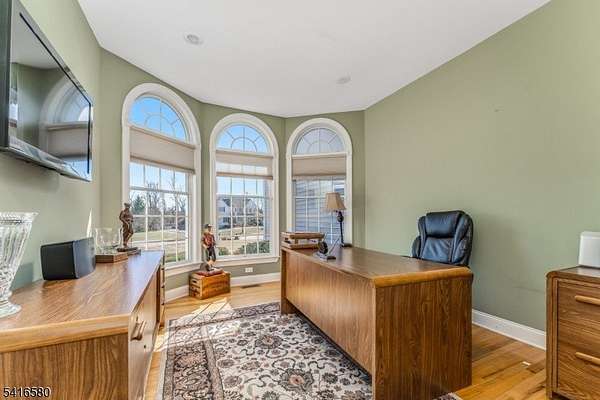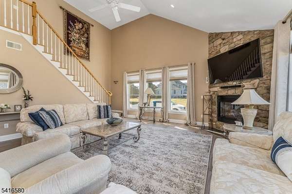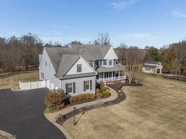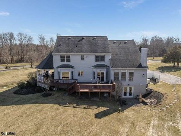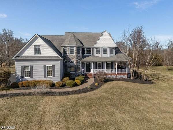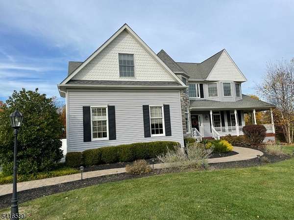 Welcome to this stunning stone-front home in prestigious Milestone Manor Development, offering exceptional space, elegance, &comfort. A beautiful paver walkway with stone pillars and Volt lighting welcomes you to the inviting wrap-around porch, creating the perfect place to relax with privacy & enjoy the outdoors.Inside, the home features impressive 9-foot ceilings, elegant moldings, recessed lighting, & French doors throughout. The dramatic two-story family room is the heart of the home, showcasing wood flooring, updated moldings, a gas fireplace, & a mounted big-screen TV area perfect for entertaining or relaxing evenings. The spacious kitchen is designed for both everyday living & entertaining, featuring granite countertops, stainless steel appliances, tile flooring, a center island & a bright dining area that opens to an expansive deck. The formal dining room offers a charming bay window & direct access to the wrap-around porch, while the formal living room features beautiful wood flooring.The first floor also includes an office, powder room, & laundry room. Upstairs, the spacious ensuite includes a huge walk-in closet, granite countertops in the bathroom, while three additional generously sized bedrooms complete the 2nd level.Additional highlights include a whole house generator, 3-car carpeted garage, walkout basement offering endless possibilities & beautiful designed exterior details.Ideally located to Flemington's shopping, restaurants, & major highways.
