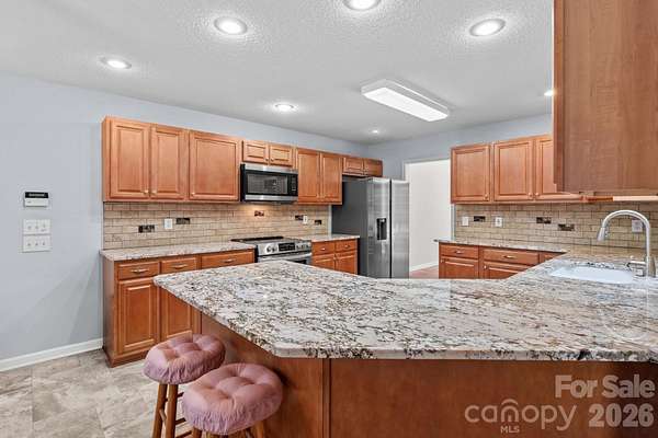 Welcome home to this stunning brick beauty nestled in the Stonebriar community! From the charming rocking chair front porch to the warm and inviting entry, this 3-bedroom, 2-bath home is designed to impress. Step inside to a spacious living room featuring vaulted ceilings, a cozy fireplace, and an open flow into the kitchen and breakfast area-perfect for both everyday living and entertaining. The kitchen shines with stainless steel appliances, granite countertops, and a stylish tile backsplash, while the elegant dining room offers vaulted ceilings and lovely views of the front yard. A split-bedroom floor plan provides privacy, highlighted by an exceptional primary suite complete with a jetted tub, new shower enclosure with glass doors, and a generous walk-in closet. Two additional bedrooms and a full bath are thoughtfully situated on the opposite side of the home. Upstairs, a versatile 507 sq ft bonus room offers endless possibilities for a home office, recreation space, or guest retreat. Natural light fills every corner of this home, enhancing its welcoming feel. Thoughtful upgrades have been completed, including a new roof, downstairs HVAC system, and an insulated garage door-adding both value and peace of mind. Situated on a private 1.7-acre lot surrounded by trees, you'll enjoy peaceful outdoor living with ample patio space for relaxing or entertaining. All of this in a wonderful community with no city taxes-this is one you won't want to miss!
