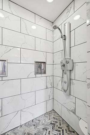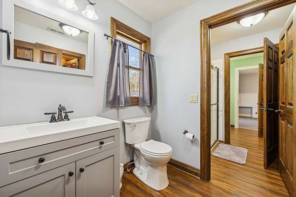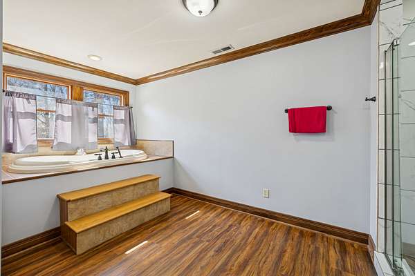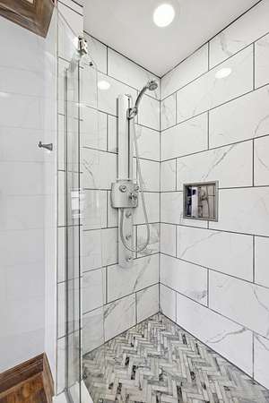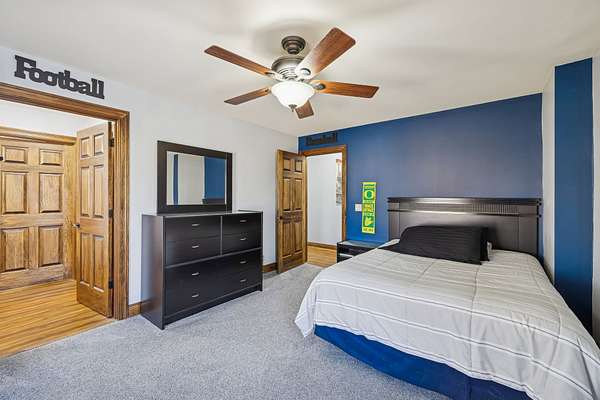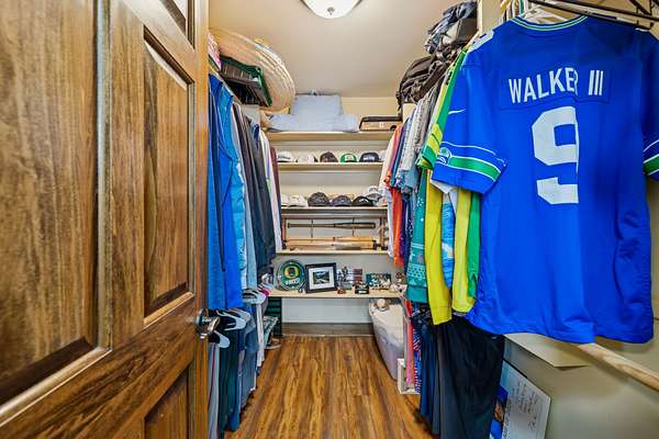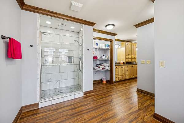The private Primary Suite feels like its own retreat, highlighted by a 12-foot ceiling, pine T&G accents, and oversized walk-in closets with exceptional storage. Upstairs, two spacious bedrooms share a Jack-and-Jill bath and enjoy the convenience of an upper-level laundry.