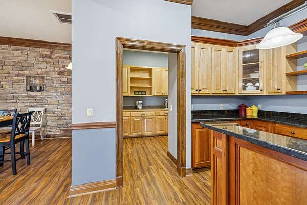 The kitchen features custom maple and cherry cabinetry, granite countertops, and a Butler’s Pantry, blending craftsmanship with practical design for entertaining and daily living.
