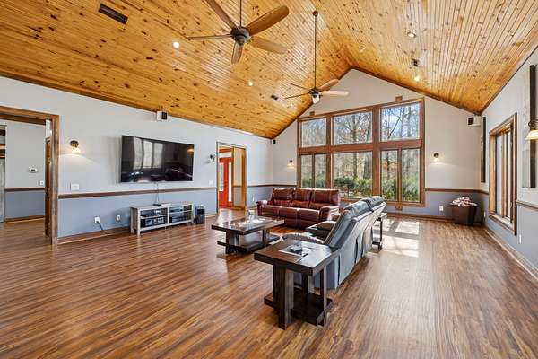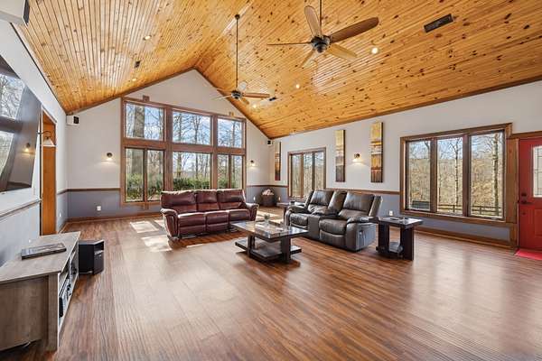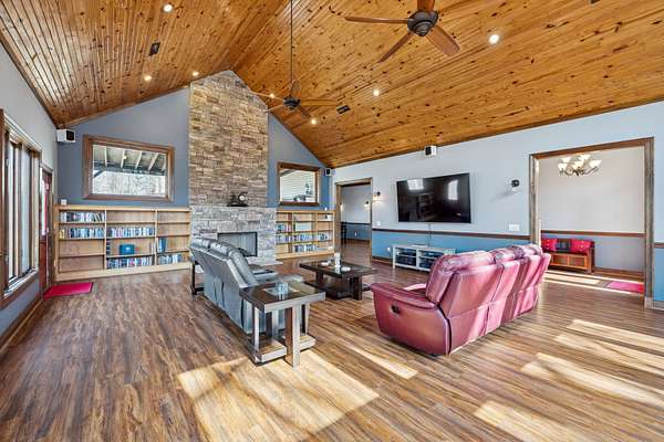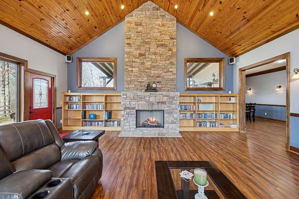 Step inside to a dramatic Great Room with an 18' ceiling, warm pine tongue-and-groove detail, and a striking stone fireplace that anchors the heart of the home. Large casement windows fill the space with natural light and capture the peaceful hilltop surroundings.