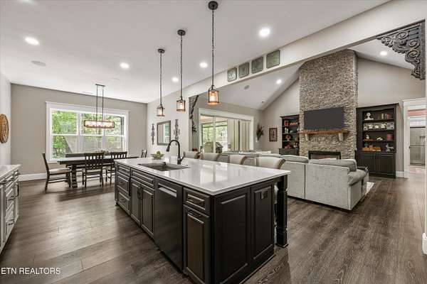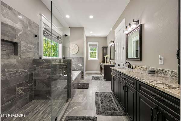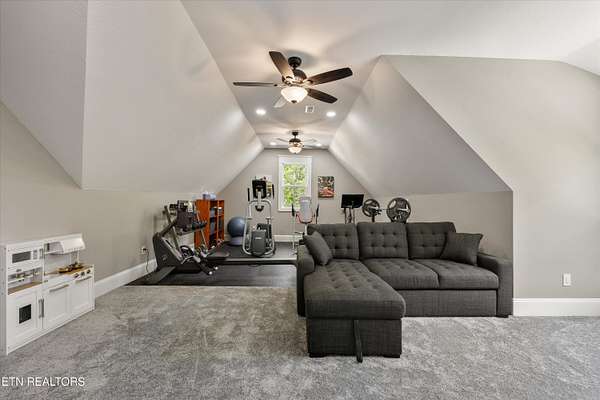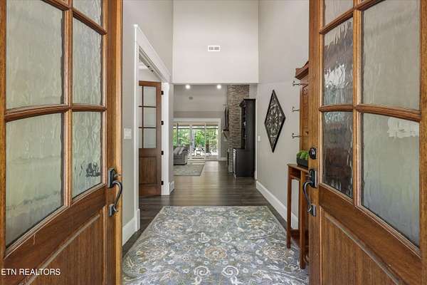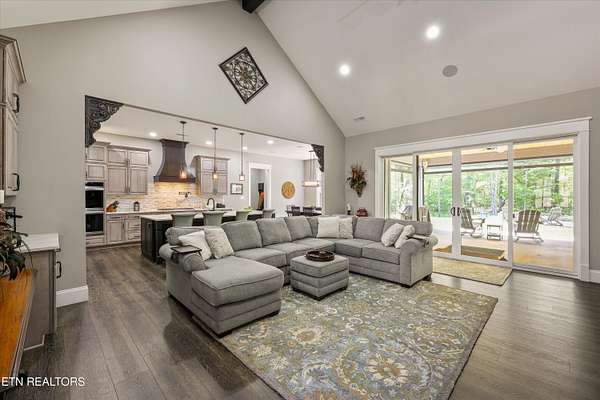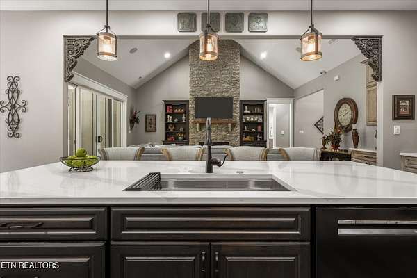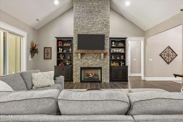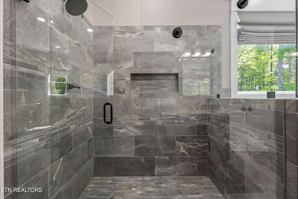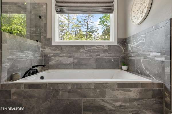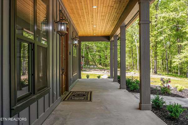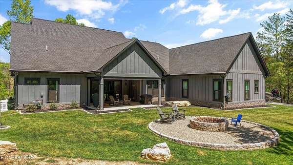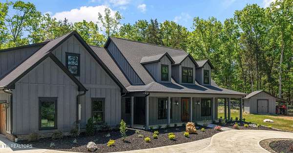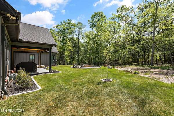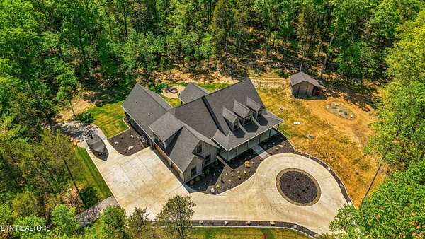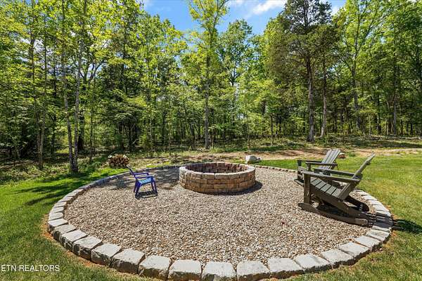 Nearly new ranch-style traditional home, completed in 2025, sits on 12.5 private wooded acres in the desirable Grande Vista Bay Community in Rockwood, Tennessee. The property offers a peaceful, secluded setting with convenient access to upscale amenities, including a clubhouse, pool, pickleball courts, and community marinas. A scenic walking trail through the woods leads directly to these features, while nearby Watts Bar Lake--spanning 39,000 acres--provides endless opportunities for boating and fishing. Designed with modern living in mind, the home showcases high-end finishes and thoughtful details throughout. The exterior features board and batten Hardie cement siding with stone accents, a circular concrete driveway, an oversized three-bay garage, and a covered front porch with a natural wood ceiling. A spacious 20x20 patio with automatic retractable screens creates the perfect indoor-outdoor living space. Additional upgrades include a whole-house generator, surround sound system, hardwired WiFi access points, and a security system. Inside, the home offers 10-foot and cathedral ceilings, with a trey ceiling enhancing the primary suite. The great room is anchored by a striking 25-foot stone fireplace, while durable luxury vinyl plank flooring runs throughout the main level. The kitchen serves as the heart of the home, featuring a large island, quartz countertops, tile backsplash, walk-in pantry, coffee bar, and high-end stainless steel appliances, including a smart oven and premium 6 burner Thermador gas cooktop. The main-level primary suite includes dual vanities with granite countertops, a whirlpool tub, a tiled walk-in shower, and a spacious walk-in closet with custom organization that connects directly to the laundry room. An office with wood french doors sits just off the foyer. The main floor also includes three additional bedrooms and two full bathrooms, each with quartz countertops and walk-in closets. Upstairs, a versatile bonus room with a full bath provides additional living or guest space. Thoughtfully designed with comfort and functionality in mind, this home offers a perfect blend of luxury, privacy, and modern convenience.