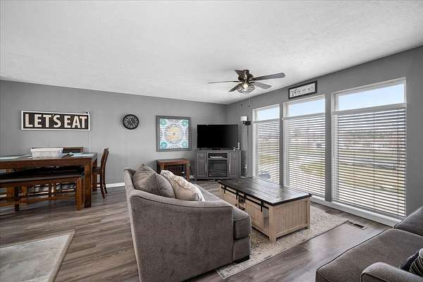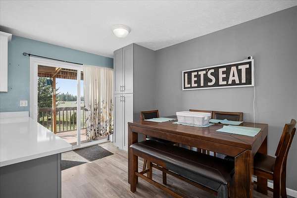 Set on nearly 5 acres, this 5-bedroom home offers space, flexibility, and a setup that's hard to find. The main level features an open-concept layout with an updated kitchen, white cabinetry, stainless appliances, quartz countertops, and a large peninsula that flows into the living and dining areas, with natural light throughout and sliding doors leading to a deck overlooking the property. The layout provides multiple living areas and room to spread out, ideal for everyday living, guests, or flexible use. Outside, the property truly shines with usable acreage, a 2-bay RV carport for covered parking and storage, and plenty of room to expand, all while being located just outside of town offering a balance of space, function, and convenience.