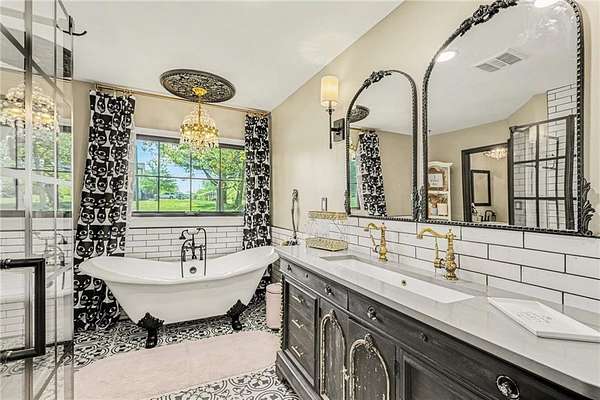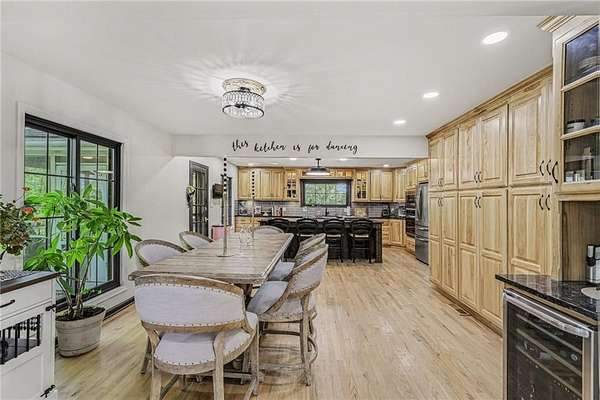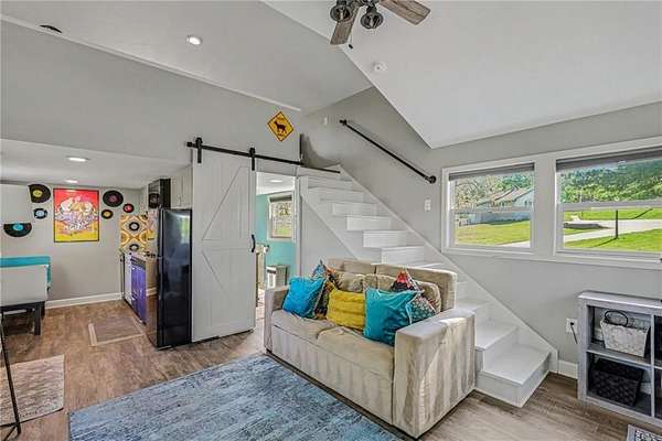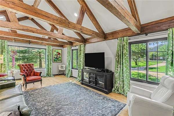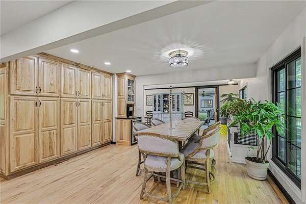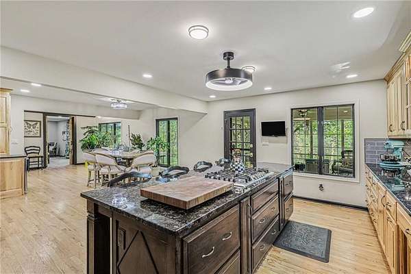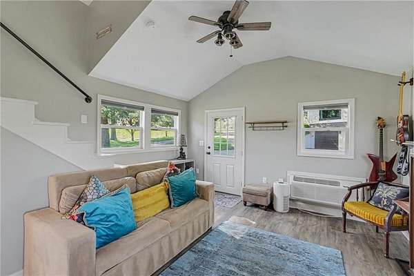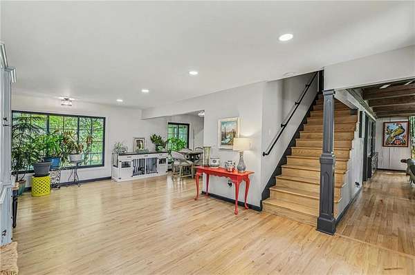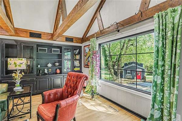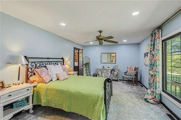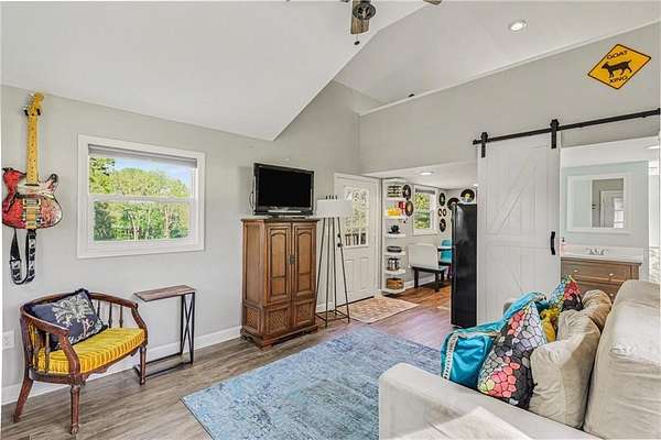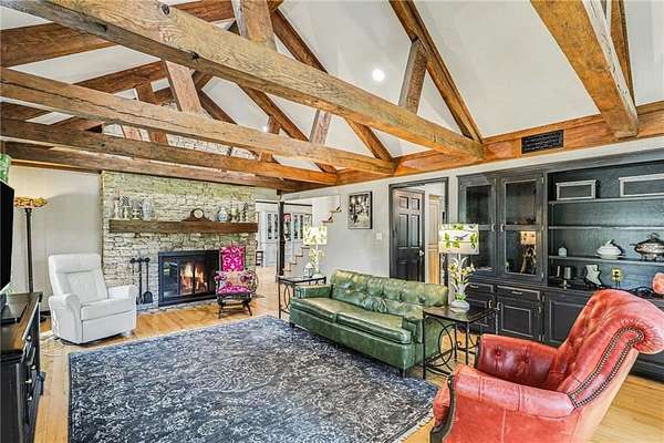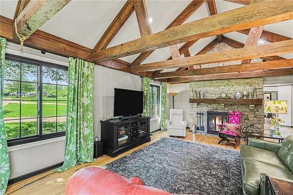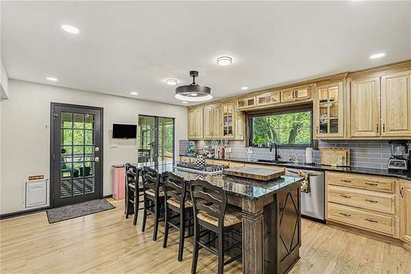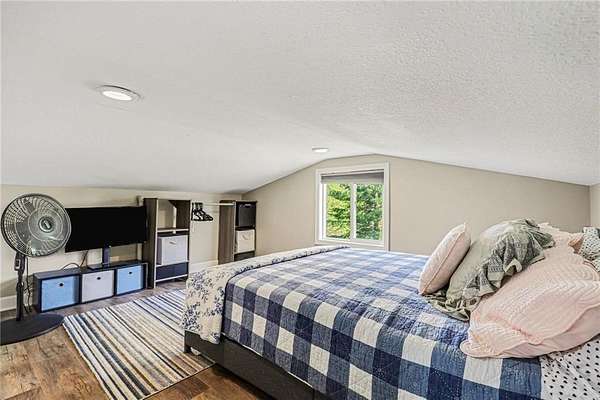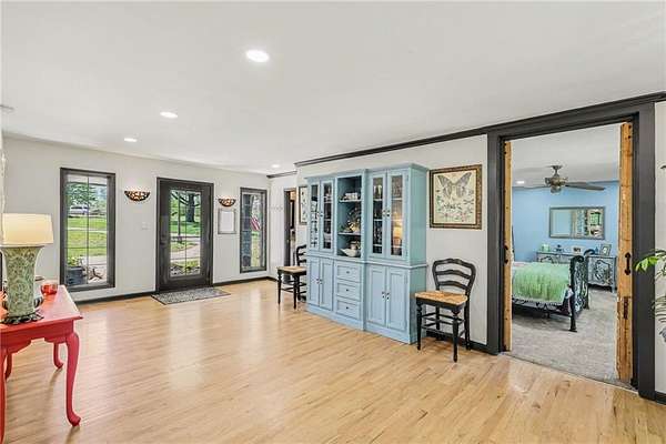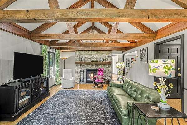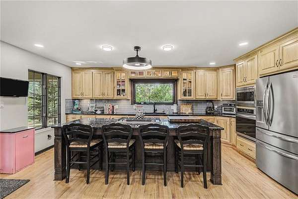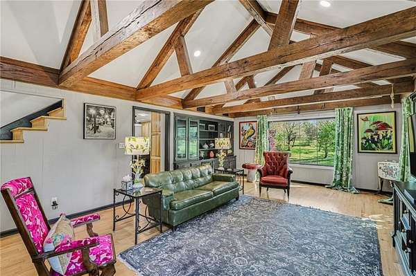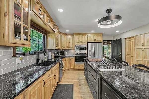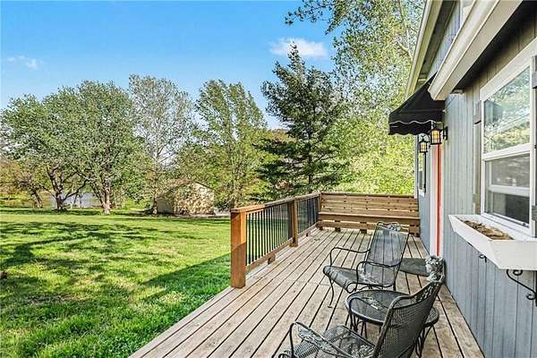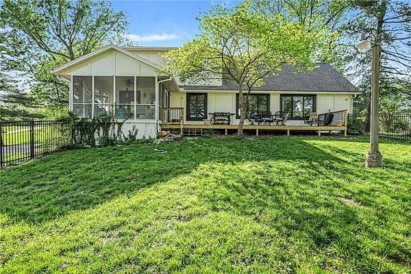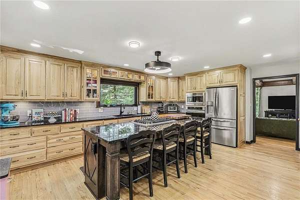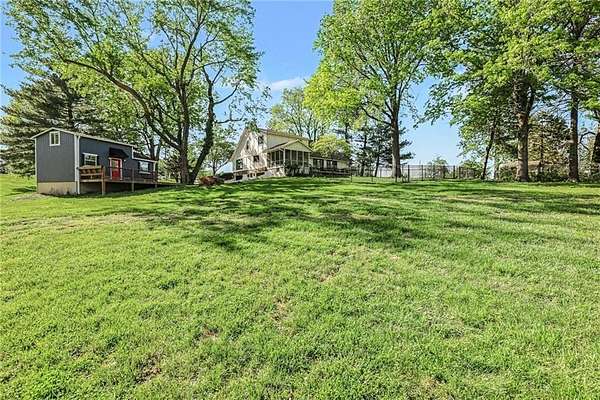 A rare opportunity to enjoy tranquil acreage living within city limits, this beautifully maintained 1.5-story home sits on nearly 5 acres with a shared pond, offering peaceful water views and endless outdoor enjoyment. Featuring 3 bedrooms, 3 bathrooms, and a 4-car tandem garage, this property blends space, functionality, and lifestyle in one unique setting. Step inside to a warm and inviting main level highlighted by vaulted ceilings with exposed wood beams, rich hardwood floors, and a stunning stone fireplace with a gas starter in the living room. The kitchen is designed for both everyday living, featuring custom hickory cabinetry, an oversized island, and abundant storage with convenient pull out shelves. Just off the kitchen, the screened-in porch or the NEW deck both provide the perfect place to relax while overlooking the pond and expansive backyard. The main-level primary suite is a true retreat, positioned to capture beautiful sunrise views over the water with NEW windows. The updated en-suite bathroom features a double vanity with quartz countertops, a fully tiled walk-in shower, and an oversized clawfoot tub and laundry. Upstairs, you'll find two spacious bedrooms, a full hall bath with updated tile and custom inserts for shower convenience, and an additional flex room ideal for a home office or extra storage.The lower level offers additional storage, full bath, pet spa, mudroom, second laundry, access to the garage and workshop areas. Outdoor living is just as impressive, with open acreage, fruit trees, garden beds, and multiple storage sheds. The shared pond adds to the charm, perfect for fishing. Enjoy the partial NEW fence in the yard perfect for pets. Adding exceptional value, the accessory dwelling unit offers a fully functional space ideal for guests, extended family, or rental income potential. With its combination of scenic views, flexible living spaces, and income opportunity, this property offers comfort, privacy, and convenience all in one.