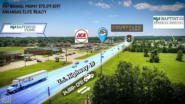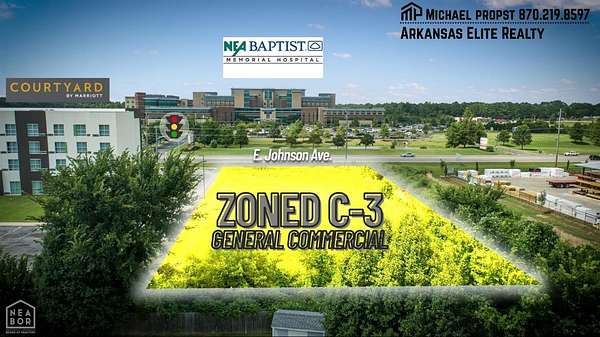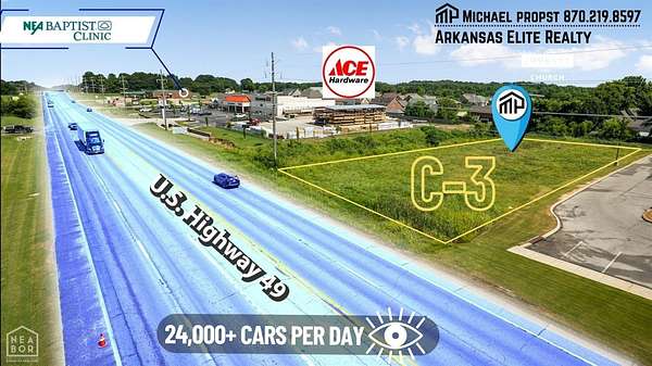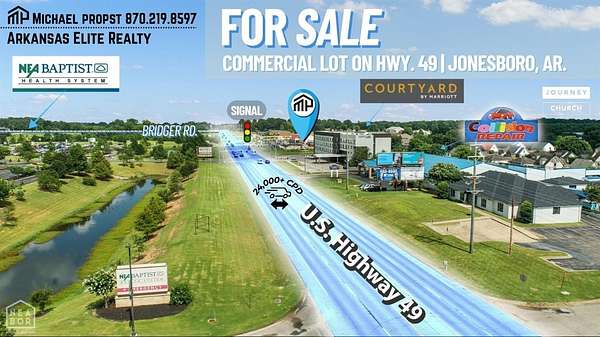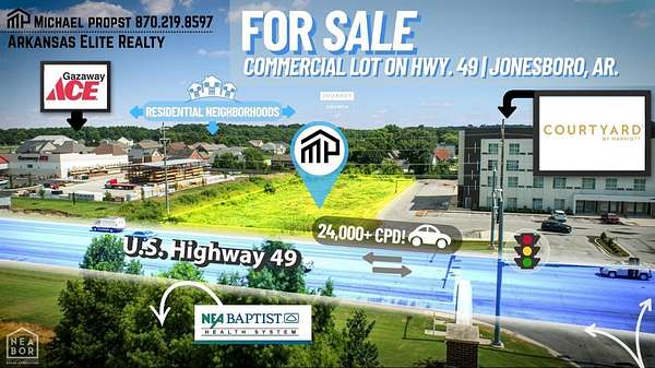 Est $5,622/moThis prime development site is located in the booming Hilltop area of Jonesboro, Arkansas with approximately 113 feet +/- of frontage of the Highway 49 N. travel corridor. Last measured ADT is approximately 24,000 vehicles per day! Directly across from the new NEA Baptist Medical Systems Campus at Hilltop and adjacent to the new Courtyard by Marriott at a signalized intersection, this .77 acre parcel is perfect for most commercial projects since it is zoned C-3. Several other national brands and amenities are in close proximity as well, including Arkansas State University, multiple banks, churches, restaurants (including QSR), and many others! Seller says bring an offer, price is negotiable!
