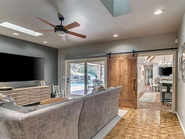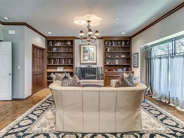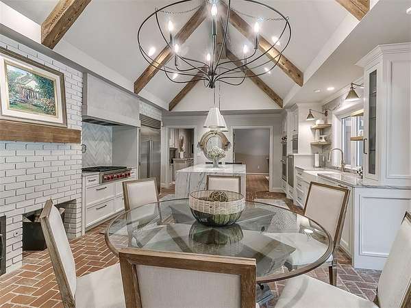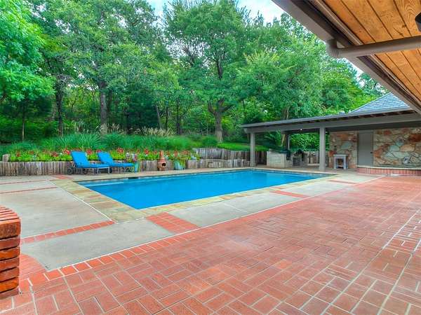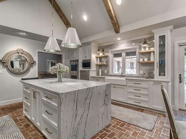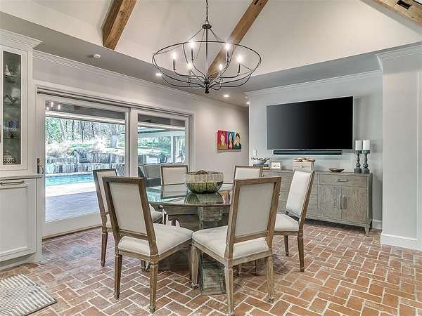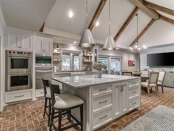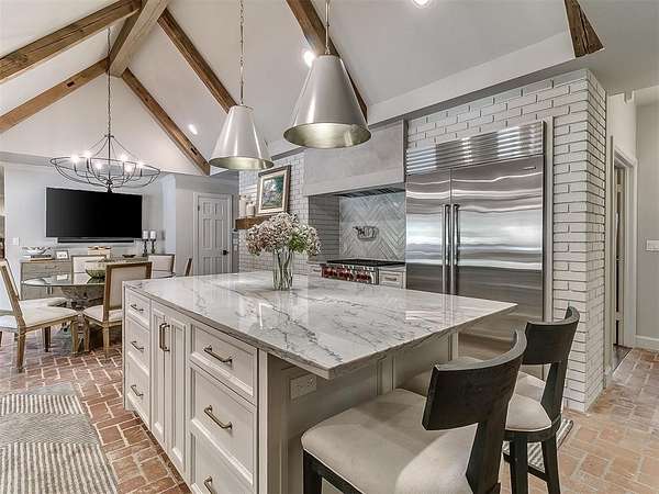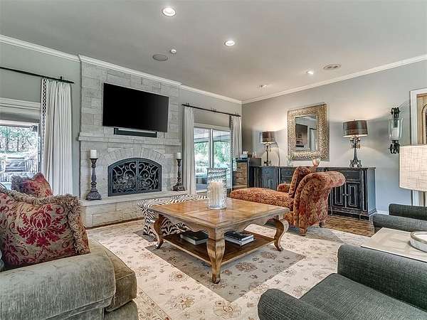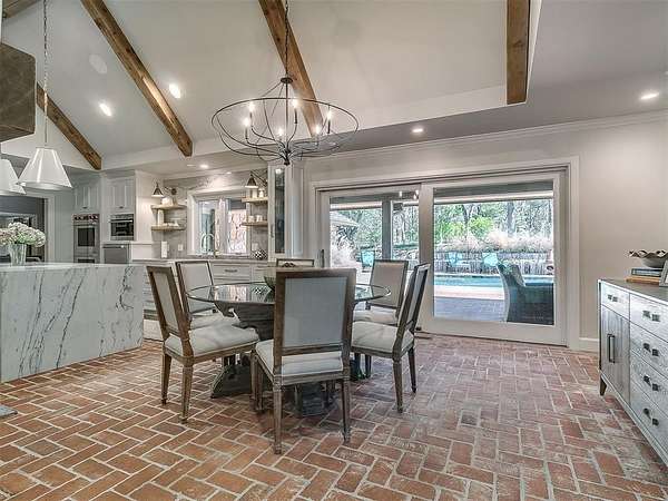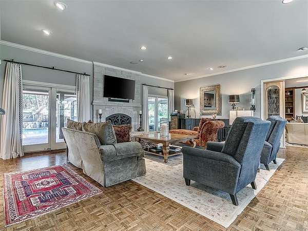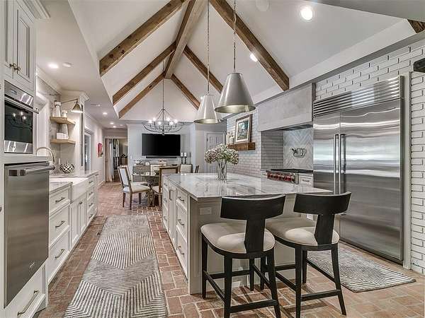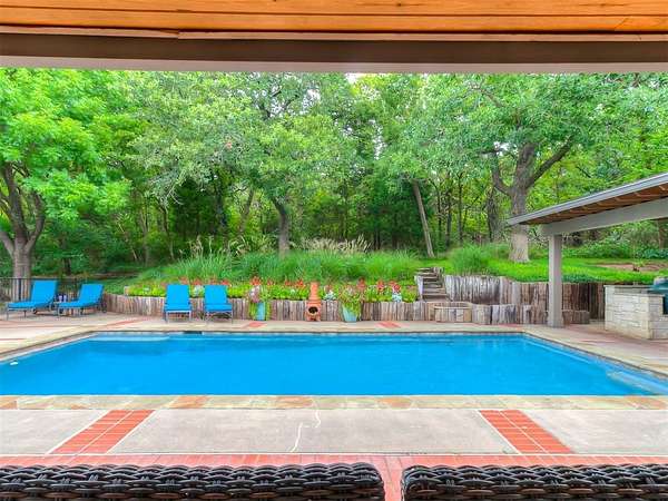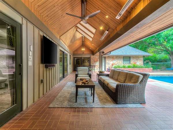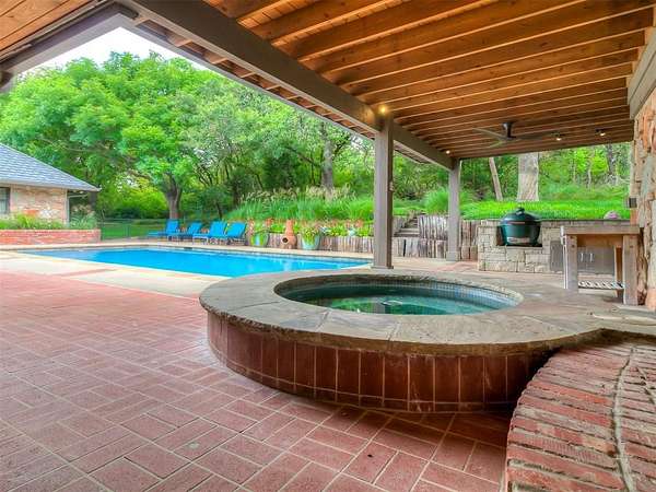 Situated on 2.5 lush acres with a circular drive, this exceptional residence showcases refined craftsmanship and high-end finishes throughout. The fully remodeled chef's kitchen-designed in collaboration with a renowned designer-serves as the heart of the home, featuring waterfall quartz countertops, custom cabinetry, floating shelves and premium appliances including Sub-Zero refrigeration and a Wolf 6-burner gas range with double ovens. Wood beams, gorgeous lighting and a charming a fireplace add warmth to this space. The kitchen leads to an expansive living area with custom built-ins, a cast stone fireplace, parquet wood flooring and walls of windows filling the space with natural light. A stylish bar with sink and storage enhances the home's entertaining appeal. The private primary suite offers a spacious retreat with dual vanities, an oversized walk-in shower, sunken soaking tub and separate closets with built-ins. Additional features include a formal dining room featuring a distinctive brick accent wall adding warmth and character, office with built-ins and fireplace, and a flexible living space with barn door and patio access. Three secondary bedrooms offer walk-in closets, including a Jack-and-Jill bath and a separate full hall bath with pool access. An oversized laundry room features granite countertops, a farmhouse sink, 2-drawer beverage refrigerator, mud bench and an additional full bath. Step outside to a resort-style backyard where lush landscaping surrounds the pool, complete with swim-out ledges, a heated smart hot tub, built-in patio heaters, and an outdoor kitchen with dual Green Egg grills-perfect for effortless entertaining. Other highlights include a Sonos sound system, plantation shutters, skylights and a 3-car garage with epoxy floors, built-ins, and a safe room. Major updates include HVAC, furnaces, roof, and aerobic septic system. Simply put, this is a beautifully designed home offering comfort, style and seamless indoor-outdoor living.