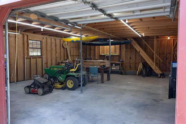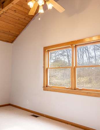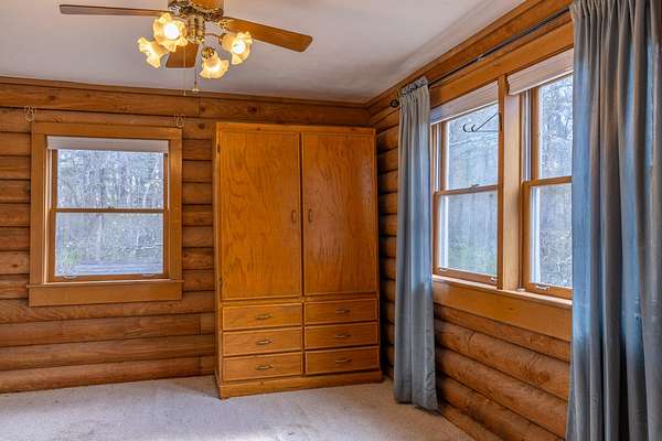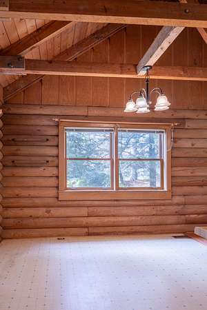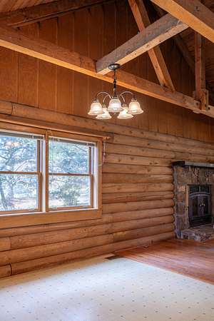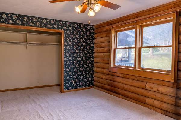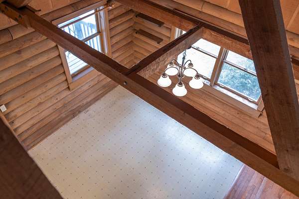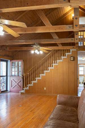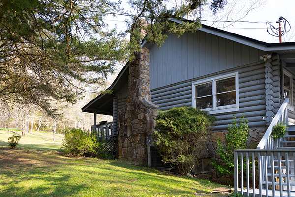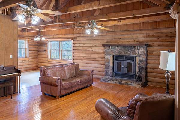 Seller offering $40,000 towards renovation of kitchen and to update flooring! Tucked away on a picturesque, tree-lined drive, this charming log-style home offers the perfect blend of privacy and rustic character. Featuring soaring vaulted ceilings, exposed beams, and a stunning stone fireplace, the spacious living area is warm and inviting. Enjoy peaceful mornings on the covered front porch swing overlooking the serene acreage. The property also includes a large barn/garage with ample storage and workspace. Surrounded by nature yet conveniently located, this unique retreat is ideal for those seeking quiet country living with timeless charm. All information to be verified. Full 1bd/1bath with full kitchen Mother-in-law apartment on lower level! Garden spot with abundant well water available nearby.
