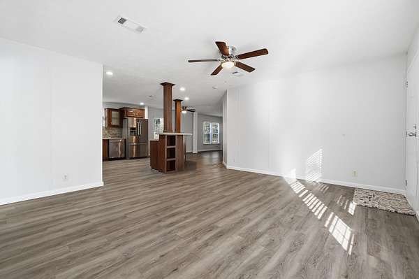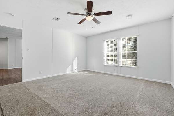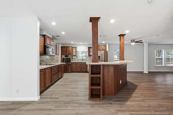 Enjoy peaceful lakefront living in this beautifully refreshed manufactured home, offering a split-bedroom floor plan and generous living space. The home features vinyl plank flooring throughout the main living areas with brand-new carpet in the bedrooms, plus fresh interior paint for a clean, move-in-ready feel. The kitchen is well-appointed with stainless steel appliances, a tile backsplash, smooth-top stove, and built-in oven, making it both stylish and functional. A cozy fireplace anchors the living area, perfect for relaxing evenings. The private primary suite includes an updated vanity, garden tub, and separate shower. Recent updates throughout the home include new water heater will be installed soon, new ceiling fans, updated lighting, new smoke detectors, and fresh finishes. Situated on lake front lot with great fishing and a dock, this property offers exceptional outdoor enjoyment. The seller is in the process of splitting the lot, and the new acreage will be approximately 2 acres, plus or minus. A carport provides covered parking and added convenience. Don't miss this opportunity to own a refreshed lakefront home with acreageschedule your showing today!