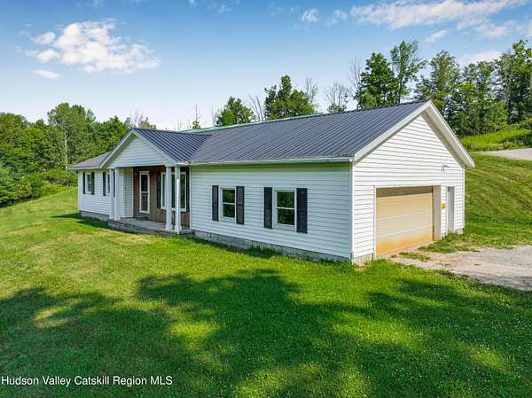 Move-in ready 3BR, 1BA home on 2.68 acres with mountain views, just 10 mins from Middleburgh. Features include LR, kitchen/dining combo, sitting room with wood stove, full unfinished basement w/ washer & dryer, Bilco access, and twin 275-gal oil tanks. Boiler w/ indirect WH and aux wood stove hookup. Separate electric WH. 2-car attached heated garage. Metal roof (5 yrs old). Includes massive 40'x105' metal pole barn-ideal for equipment, workshop, or hobby farm. Peaceful setting with room to grow!
