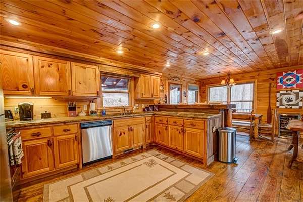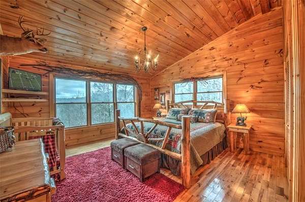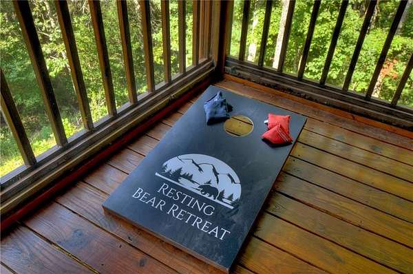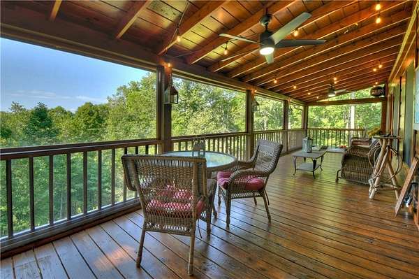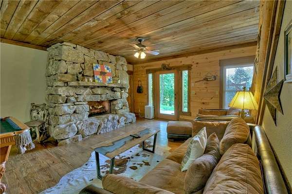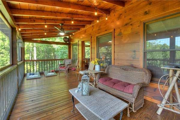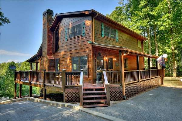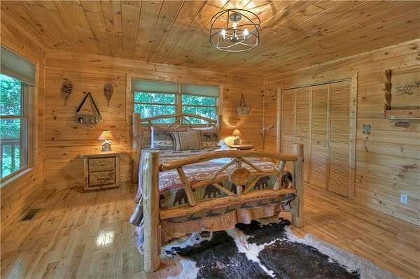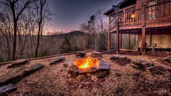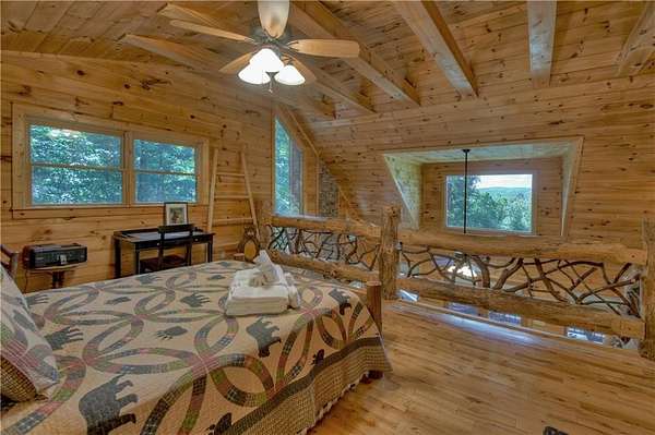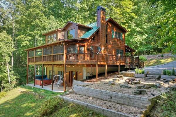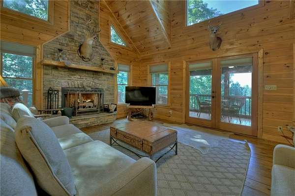 Nestled high on a serene hillside in the coveted Aska Adventure Area, Resting Bear Retreat is a fully furnished, turnkey mountain escape with long-range views. This 3-bedroom + loft + bunk area cabin combines laid-back comfort with professional decor, offering the perfect balance of rustic charm and modern luxury. Step inside and be welcomed by soaring vaulted ceilings, warm hardwood floors, oversized windows that flood the space with natural light, and custom log stair rails leading to a cozy sleeping loft. The great room features a striking stone fireplace and french doors that open to expansive wraparound decks, designed to maximize the view and fresh mountain air. The terrace level is made for entertaining, with a full game room including a pool table and a second gas fireplace. Step outside to enjoy the lower deck's porch swing or relax in the hot tub while soaking in the peaceful surroundings. The upper deck features a screened-in porch with ample seating, a charcoal grill, and the backyard boasts a fire pit for evenings under the stars. Set on 1.7 private acres with a long driveway and generous guest parking, this cabin offers plenty of room to gather, unwind, and explore. With 3 bedrooms, an open loft sleeping area, and additional bunks on the terrace level, there's space for everyone. A proven short-term rental success, Resting Bear Retreat is being sold fully furnished - a true turnkey investment or a ready-to-enjoy personal getaway in the Blue Ridge mountains.
