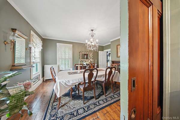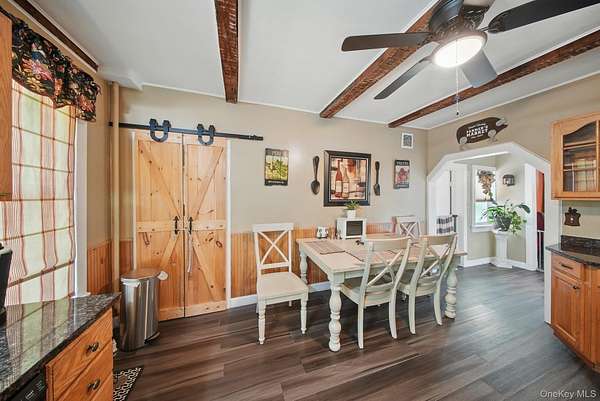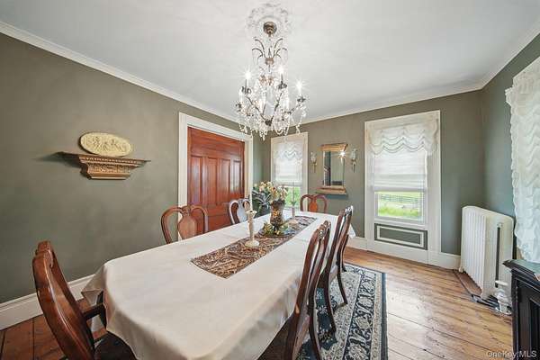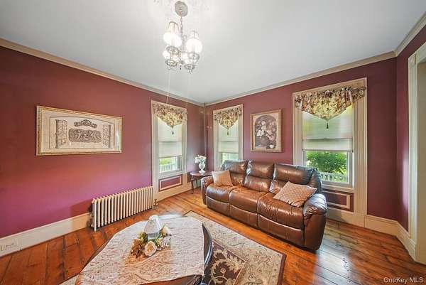 Classic 1863 Farmhouse in Mint Condition - Riverfront Property in Goshen School District. Step into timeless elegance with this beautifully restored 1863 farmhouse, set on 10 picturesque acres in the highly desirable Goshen School District. This 5-bedroom, 3-bath home offers the perfect blend of historic charm and modern convenience, featuring original hardwood floors, a brick fireplace, intricate crown molding, and a formal dining room with classic appeal. Enjoy peaceful mornings on the wraparound porch, take in breathtaking horse farm views, or spend the afternoon fishing in your private pond. The property also boasts direct riverfront access-perfect for kayaking, fishing, or simply soaking in the natural beauty. Interior highlights include updated plumbing, pocket doors, and spacious, light-filled rooms throughout. Outdoors, the property is a true sanctuary with multiple horse barns, a goat pen, chicken and duck runs, and a above ground pool fenced in with a slide-all designed for recreation and rural living at its finest. A separate 2-bedroom, 1-bath guest cottage with its own private entrance offers ideal accommodations for extended family, guests, or rental income. Perfect for Airbnb. Located just 90 minutes from NYC, 15 minutes to Stewart Airport, and close to local shopping and amenities, this unique estate is a rare opportunity to own a piece of Hudson Valley history.