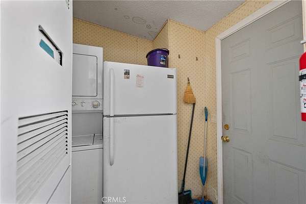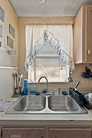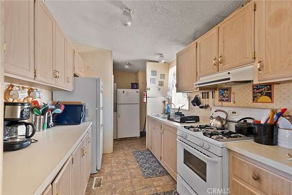 Inside, vaulted ceilings and abundant natural light create an open and inviting feel. The living room is carpeted and flows into the dining area, which sits just off the galley-style kitchen. The kitchen features a gas stove and a window over the sink that frames the desert scenery. A laundry area with washer/dryer hookups provides convenient access to the back patio.