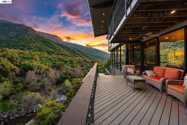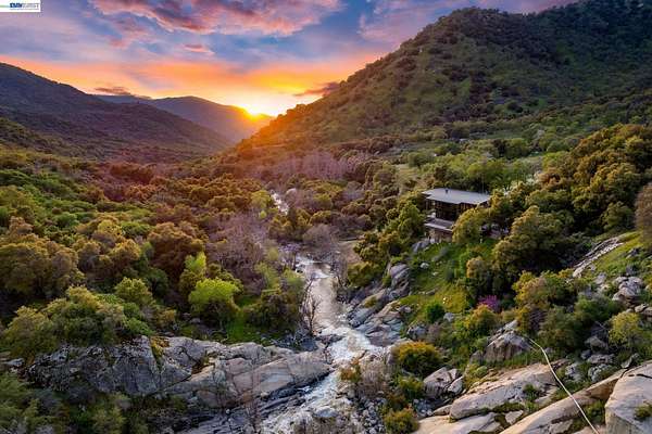 Nestled along the South Fork of the Kaweah River near Sequoia National Park, this extraordinary estate offers unmatched serenity and investment potential. A 22-ft cascading waterfall flows into private swimming ponds, creating a true oasis on 43+ acres. Perfect as a luxury vacation rental, boutique lodge, corporate retreat, or entertainment venue, this 3,500+ sq. ft. steel-framed masterpiece features three en-suite bedrooms, each with a viewing deck, plus a versatile multi-purpose room/office that could serve as a 4th bedroom. Floor-to-ceiling gold reflective windows showcase breathtaking views of the waterfall, river & mountains. The grand family room stuns with vaulted wood ceilings, solid oak flooring & a 24-ft stone fireplace. A chef's dream kitchen boasts a massive stone island, top-tier appliances & a walk-in pantry. This extraordinary property offers sustainable luxury, with a 400-ft private well, a deeded flume for a reliable water & potential electricity source & owned solar panels with a transferrable 25-year warranty feeding directly into the grid. Whether you're seeking a private sanctuary, a Luxury investment property or an unforgettable event venue, this estate is a rare opportunity to own an exclusive retreat in one of the most breathtaking locations imaginable!