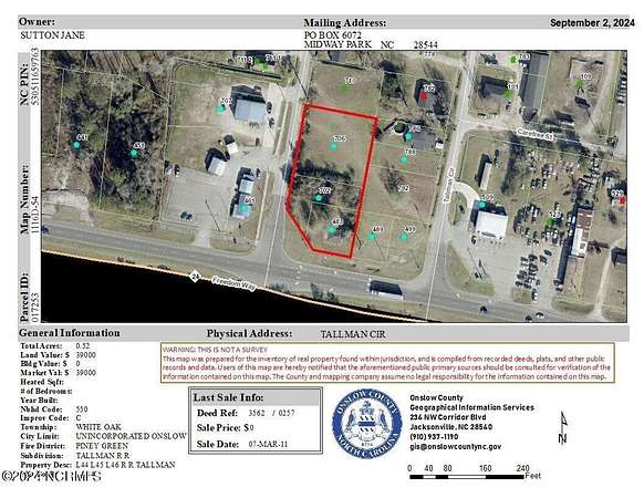 Est $2,848/moGreat Developement opportunity! Corner lot. Just under one acre of cleared land. Less than 0.5 miles from Piney Green Rd. and MCB Camp Lejeune Piney Green entrance. No city taxes, No city regulations. Road frontage on both Freedom Way (Hwy 24) AND Tallman Circle. NC DOT turn lane onto Tallman Cir. ONWASA force main available. ONWASA water taps installed. Onsite septic systems in place.