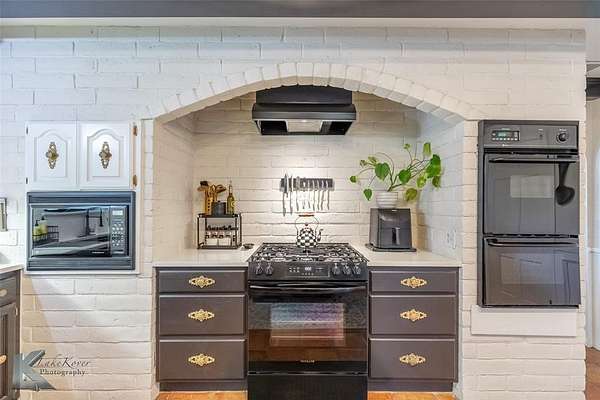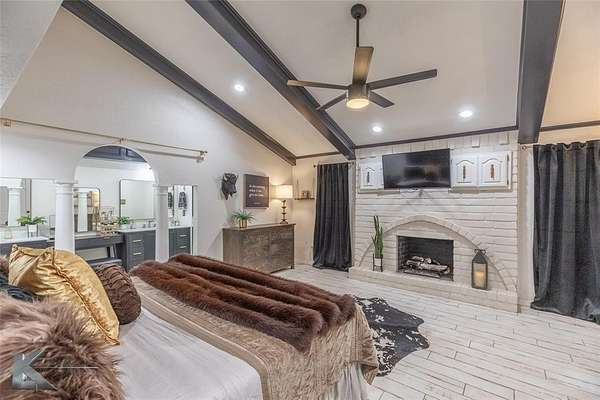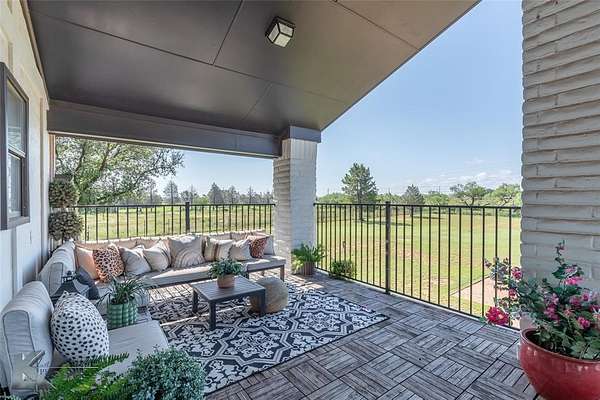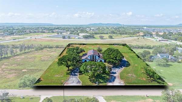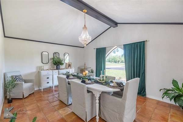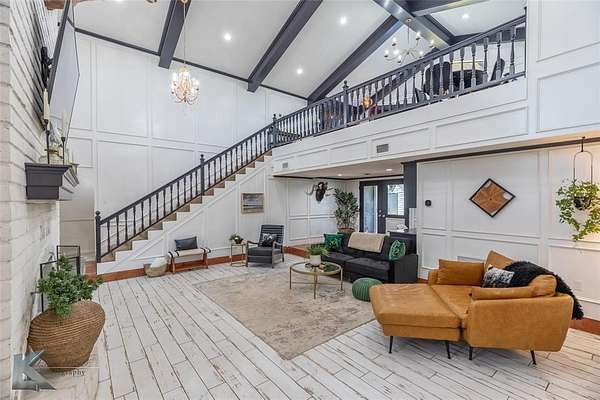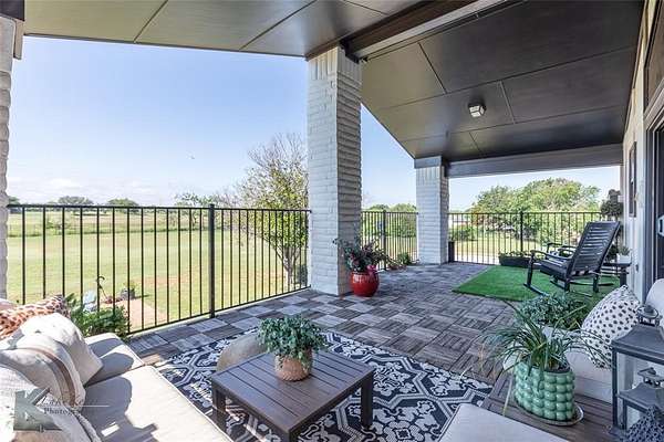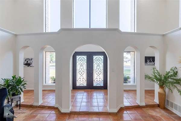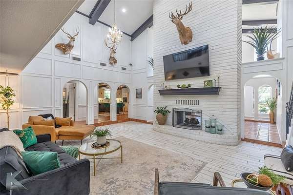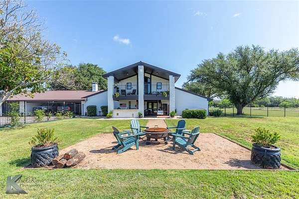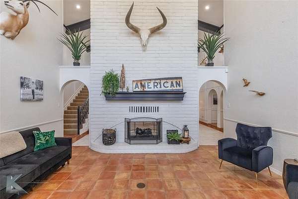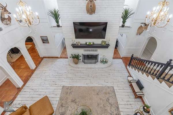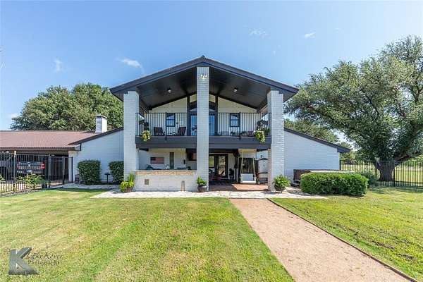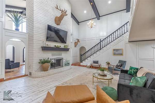 Welcome to this meticulously reimagined & curated home on 2.5 shaded acres in Abilene's desirable southside. Panoramic views create a scenic backdrop as the circular driveway & generous parking welcome you to a hand laid brick path & stately entrance. Through wrought iron doors, a soaring sunlit foyer showcases architectural flair, columned archways & offers multiple pathways through the home. A grand double sided fireplace draws attention, accented by Restoration Hardware chandeliers that anchor the space with timeless elegance. Archways create seamless flow between formal & main living areas in an open concept design, while gas logs provide effortless warmth & cozy ambiance. Striking ceiling beams draw the eye upward, echoing into the adjacent chefs kitchen where porcelain floors meet quartz countertops & a brick arched gas range. Blending form & function, the kitchen includes crisp white backsplash, a furniture style island beneath a sophisticated chandelier, walk in pantry & a charming coffee bar. The formal dining room exudes grace with a crystal chandelier, custom millwork & arched window. The primary suite is a true retreat with vaulted ceilings, custom molding & a second fireplace. The ensuite offers dual vanities, two walk in closets, a private commode & a spa style rainfall shower. Secondary bedrooms are tucked in a private wing with great storage; two share a Jack and Jill bath while a guest suite enjoys a private bath. Choose from two offices with built ins, and enjoy a spacious laundry with sink & half bath. The second story loft with wet bar, game space, full bath & balcony offers panoramic views. Outdoor living shines with a built in kitchen with sink, grill, Green Egg spot and TV hookup perfect for entertaining beside a backyard fire pit or soaking in the hot tub. A refined home delivers luxury, function & thoughtful spaces for hosting, working & living with ease.