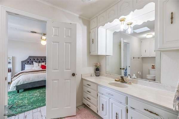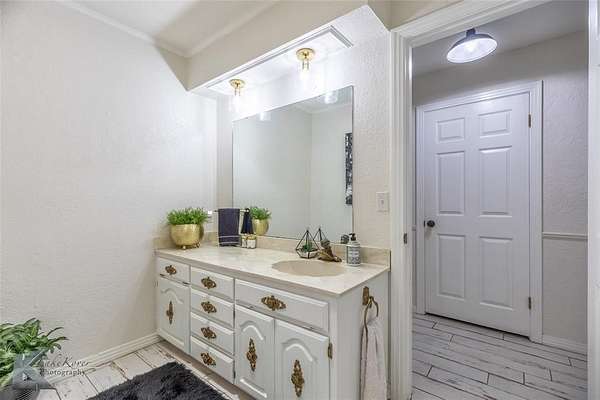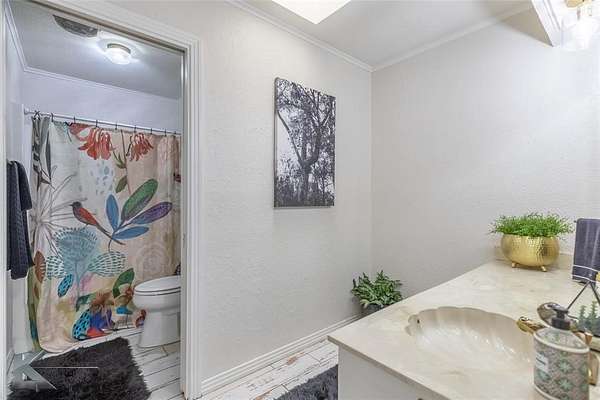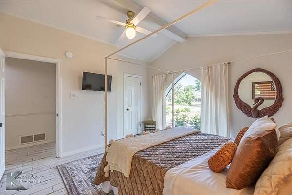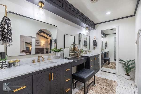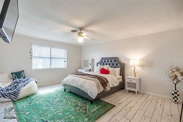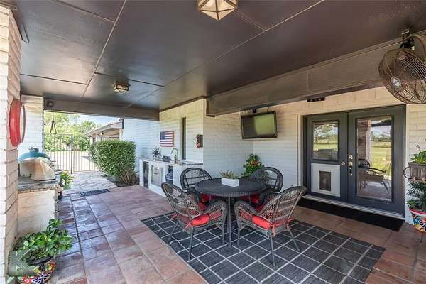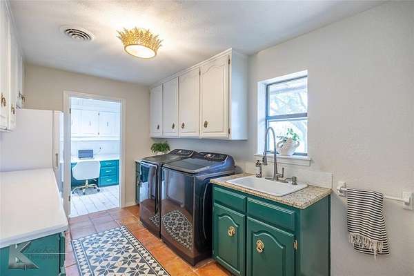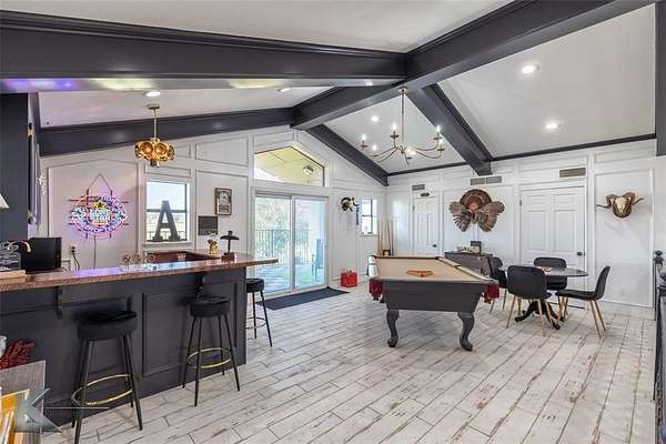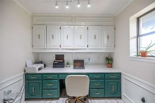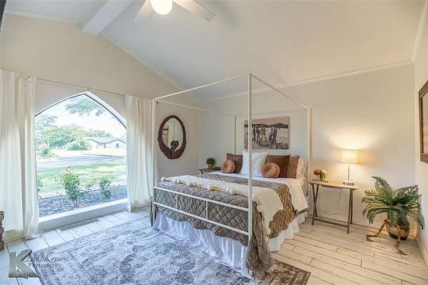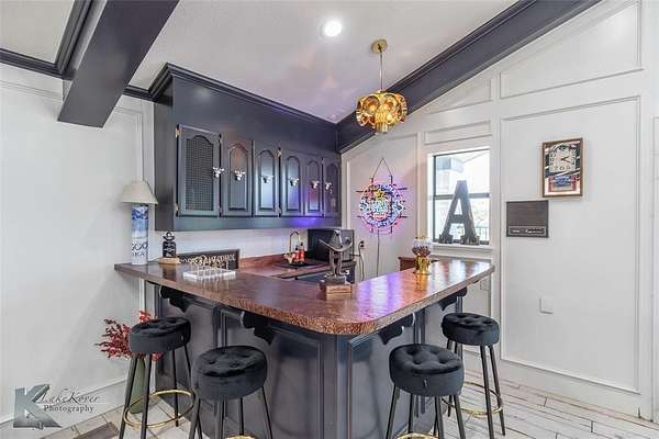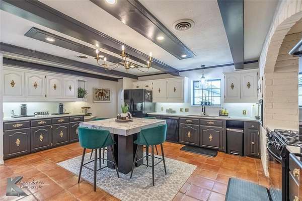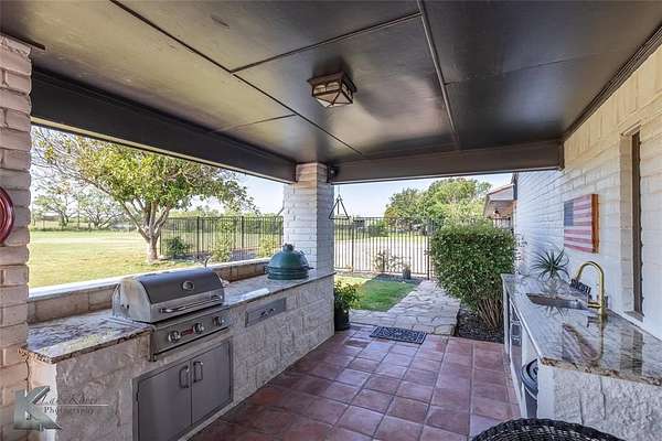 Welcome to this meticulously reimagined & curated home on 2.5 shaded acres in Abilene's desirable southside. Panoramic views create a scenic backdrop as the circular driveway & generous parking welcome you to a hand laid brick path & stately entrance. Through wrought iron doors, a soaring sunlit foyer showcases architectural flair, columned archways & offers multiple pathways through the home. A grand double sided fireplace draws attention, accented by Restoration Hardware chandeliers that anchor the space with timeless elegance. Archways create seamless flow between formal & main living areas in an open concept design, while gas logs provide effortless warmth & cozy ambiance. Striking ceiling beams draw the eye upward, echoing into the adjacent chefs kitchen where porcelain floors meet quartz countertops & a brick arched gas range. Blending form & function, the kitchen includes crisp white backsplash, a furniture style island beneath a sophisticated chandelier, walk in pantry & a charming coffee bar. The formal dining room exudes grace with a crystal chandelier, custom millwork & arched window. The primary suite is a true retreat with vaulted ceilings, custom molding & a second fireplace. The ensuite offers dual vanities, two walk in closets, a private commode & a spa style rainfall shower. Secondary bedrooms are tucked in a private wing with great storage; two share a Jack and Jill bath while a guest suite enjoys a private bath. Choose from two offices with built ins, and enjoy a spacious laundry with sink & half bath. The second story loft with wet bar, game space, full bath & balcony offers panoramic views. Outdoor living shines with a built in kitchen with sink, grill, Green Egg spot and TV hookup perfect for entertaining beside a backyard fire pit or soaking in the hot tub. A refined home delivers luxury, function & thoughtful spaces for hosting, working & living with ease.
