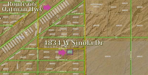 From Kingman, take I40 W to exit 44 (Shinarump) turn right, then turn left on Oatman Rd, go 6.2 miles and turn left on Sacramento Rd, continue 0.9 mi and turn right onto Sinola Dr. For Sale sign will be on the left.