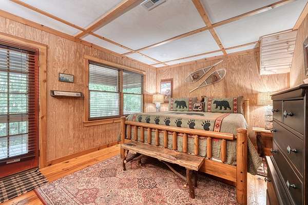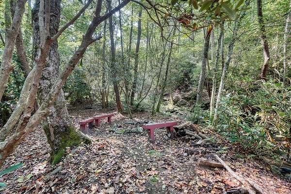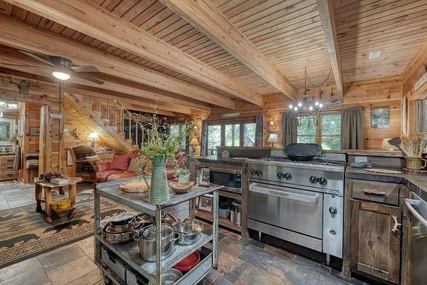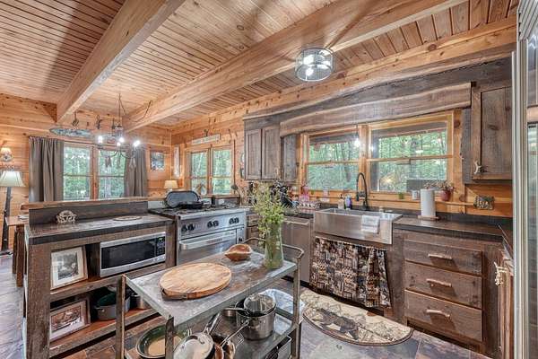 The Lazy Bear Creekside Cabin is a 3 bedroom 1.5 1.5-bath log home on 4.22 wooded acres with private creek frontage running beside the cabin. A footbridge crosses the water to an enclosed firepit on the far bank, creating a true creekside retreat. Wide covered porches wrap the main and upper levels with rocking chairs and swings overlooking the rushing creek. The primary bedroom includes a private balcony with water views. The setting feels secluded yet minutes to Lake Chatuge, hiking, waterfalls, wineries, and downtown Hiawassee. Inside, the cabin blends rustic charm with modern upgrades. The chef's kitchen features a Sub-Zero refrigerator, Wolf 6-burner gas range, and quality cookware. The open living area has exposed wood. Upstairs are three bedrooms and a 1/2 bath. A loft game room offers two arcade machines and lounge space. Central heat and air, smart TVs, BRME Fiber WiFi, and thoughtful furnishings convey a turn-key experience. Proven rental performer with strong reviews and repeat guests. High demand in summer, fall, and holidays, with steady year-round occupancy. Strong online presence and guest base support immediate income potential. Bonus: the property backs up to USFS!